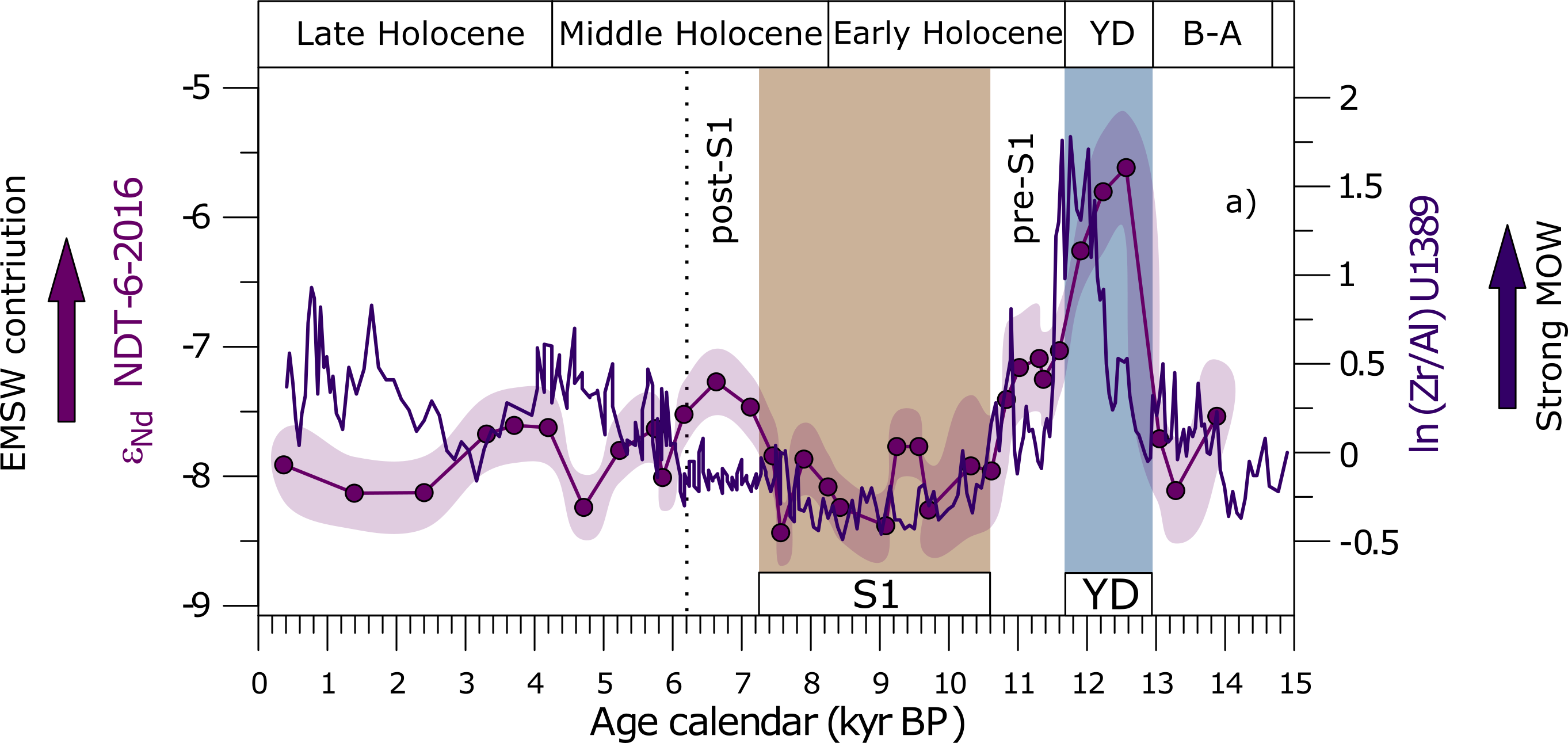 Fig. 4. Comparison between NDT-6-2016 records of Nd isotopes in planktic foraminifera coatings (this study, orange) and records of Zr/Al from Bahr et al., 2015 (blue). Grey-blue bar represents the YD (Younger Dryas) and light-brown bar the S1 (Sapropel 1).