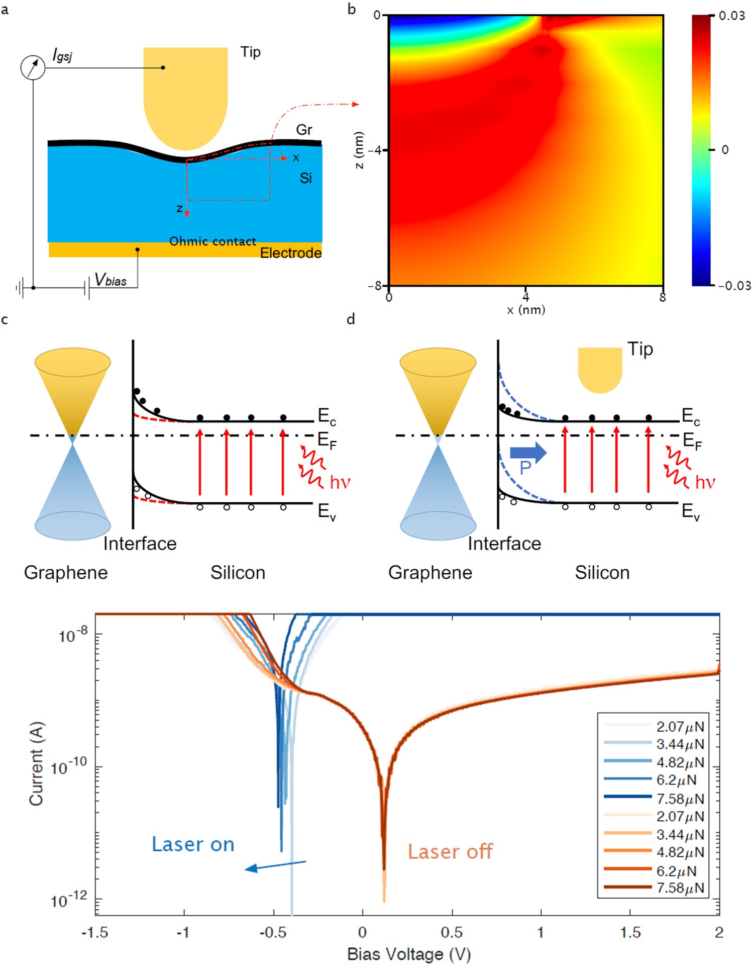 The short-circuit current (Jsc) cannot be directly obtained, because of the instrument current-limits. Nevertheless, the photoresponse [in Figs. 3(a) and 3(b)] implies that this GSJ device has an evident photovoltaic effect. To further investigate the mechanical manipulation of the PV effect, we applied forces by AFM nano-indentation on the GSJ. We first turn the laser off to study the force induced effects on the GSJ. The response current (absolute value) in the forward bias area can be enlarged by increasing the applied force [Fig. 3(c)]from 2:07 to 7:58 uN, while the response current in reverse bias area maintains being cut off. Similarly, for each applied force, we then collect the current data by sweeping the bias voltage Vbias when turning the laser on, shown in Fig. 3(d). In the forward bias area, the GSJ current (IGSJ ) maintained being enlarged (absolute value) when the applied force is increased in contrast to Fig. 3(c). Due to the laser induced photoresponse, the current dramatically changed. There exists an evident photovoltaic area. By directly contrasting the I–V responses under different applied forces, the half-logarithmic graph of the absolute GSJ current as a function of bias voltage is shown in Fig. 4(a). For the laser-off cases (orange lines), the open-circuit voltage Voc remains stable under different applied forces. Remarkably, for the laser-on cases (blue lines), due to the existing photovoltaic effects, Voc varies from near zero to -0:5 V in contrast to the laser-off cases. The absolute value of Voc is increased from 0:38 to 0:46 V for more than 20%, as shown in Fig. 4(b) (the blue circles). Fitting the laser-off cases with Eq. (1), the Schottky barrier height as a function of applied forces is obtained, as shown in Fig. 4(c). The strain gradient in the substrate originates from the contacts between the tip and the substrate surface, which breaks the inverse symmetry in the silicon20,28 and cause an extra flexoelectricity induced built-in potential in addition to the native depletion layer in the GSJ. The SBH can be additionally increased by the forces.