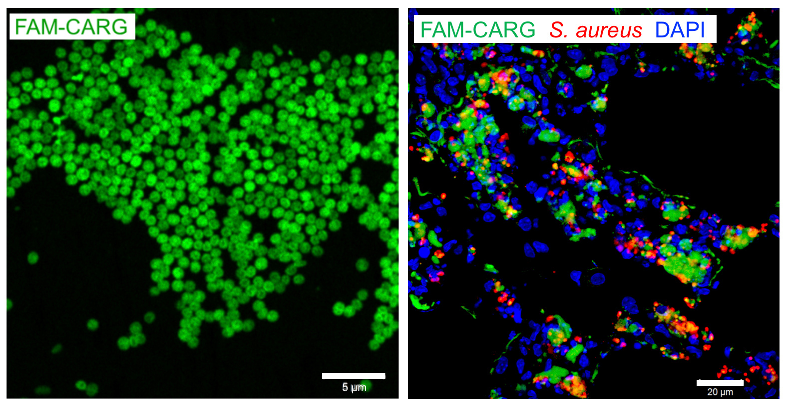 Figure 1. CARG peptide shows selective binding to S. aureus in vitro and homes to infected lungs in vivo. Binding of FAM-labeled CARG peptide to the methicillin-resistant S. aureus (MRSA) strain US300-0114 in vitro (left). The homing of FAM-labeled CARG peptide intravenously injected via the tail vein to a mouse with S. aureus lung infection (right). The FAM signal (green) shows strong homing and uptake in regions of Staphylococcal infection (red). The merged confocal image shows co-localization of the CARG peptide with bacteria at the infection site (orange). Cell nuclei in the tissue are stained with DAPI (blue). Adapted from ref.1; Macmillan Publishers.