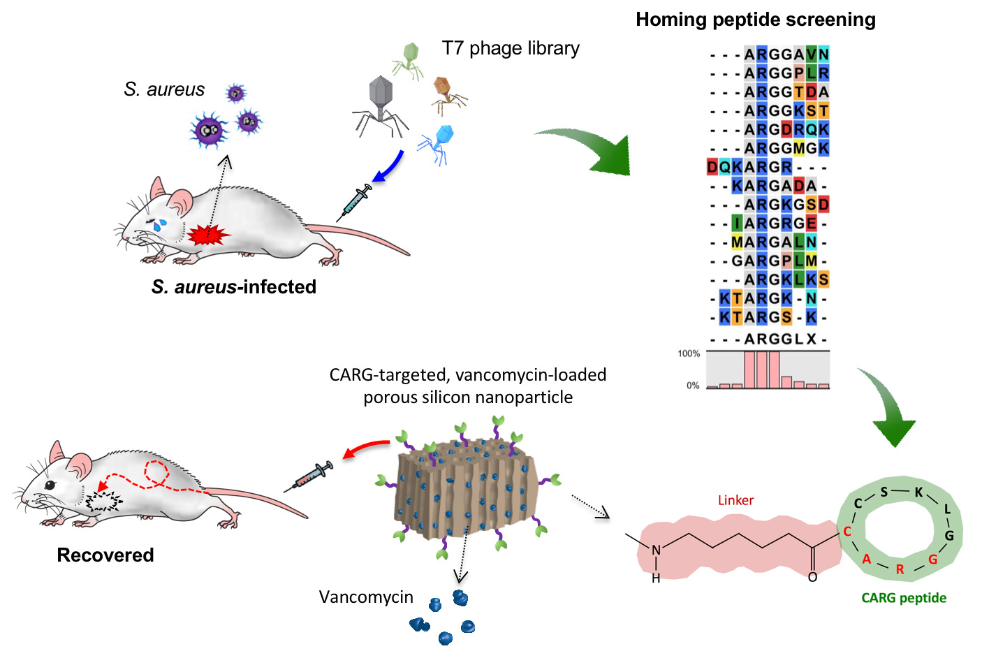 The origin of this work was a grant from the Defense Advanced Research Projects Agency (DARPA) to a consortium of long-time collaborators, Drs. Michael Sailor at the University of California, San Diego, Sangeeta Bhatia at the Massachusetts Institute of Technology, and Erkki Ruoslahti at Sanford Burnham Prebys Medical Research Institute. The initial task was to develop a platform technology for the delivery of therapeutics to infected brain injuries by peptide-guided nanoparticles. Dr. Ruoslahti, Sazid Hussain’s mentor, had been employing in vivo phage screening to identify peptides with homing properties to diseased tissues in several conditions, particularly in cancer. They have shown that coupling of drugs or drug-carrying nanoparticles to such homing peptides enhances the delivery of an anticancer drug to tumors, increasing treatment efficacy and decreasing side effects2. This method was adapted to brain injury targeting. The second element, porous silicon nanoparticle technology, was developed in Dr. Sailor’s laboratory, where Jimmy (Jinmyoung Joo, co-first author) worked. The goal of developing an agent for peptide-directed delivery of therapeutics to the injured brain by nanoparticles was to encapsulate the therapeutic agents into nanoparticles coupled to an infection-targeting peptide uncovered from the previous screen. We successfully completed this task by demonstrating delivery of siRNA for gene silencing at the injured site in mouse brains using the peptide-targeted porous silicon nanoparticle platform3. At that point, the DARPA program changed the focus of our project from infected brain injuries to more general targeting of antibiotic-resistant bacterial infections. Thus began our search for new targeting peptides for drug-resistant S. aureus for nanoparticle-based antibiotic delivery.