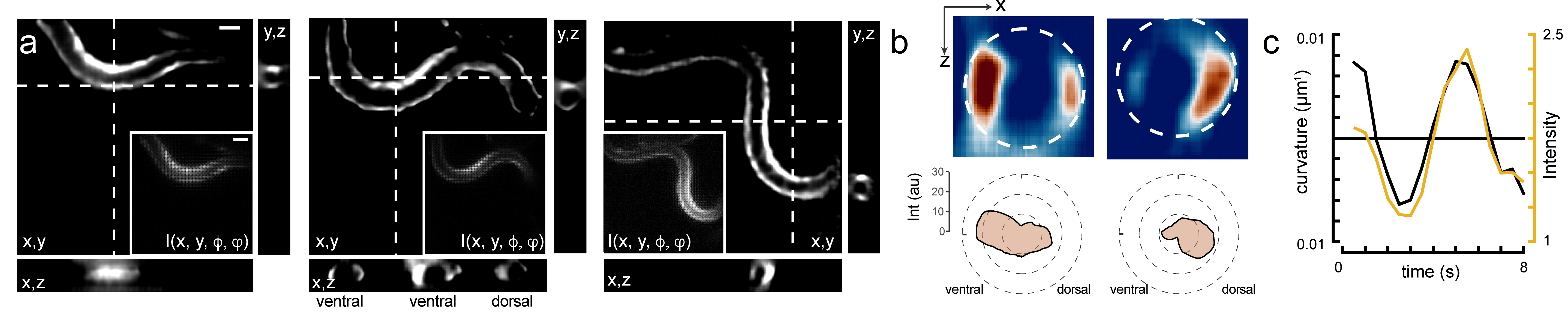 a: Three frames of a time series showing a 3D reconstruction of a moving animals with a bioluminescent Calcium indicator in their body wall muscles. b: x,z images of the Caclcium signal at two different body postures. c: Calcium signals correlate with body curvature during the time of the video.