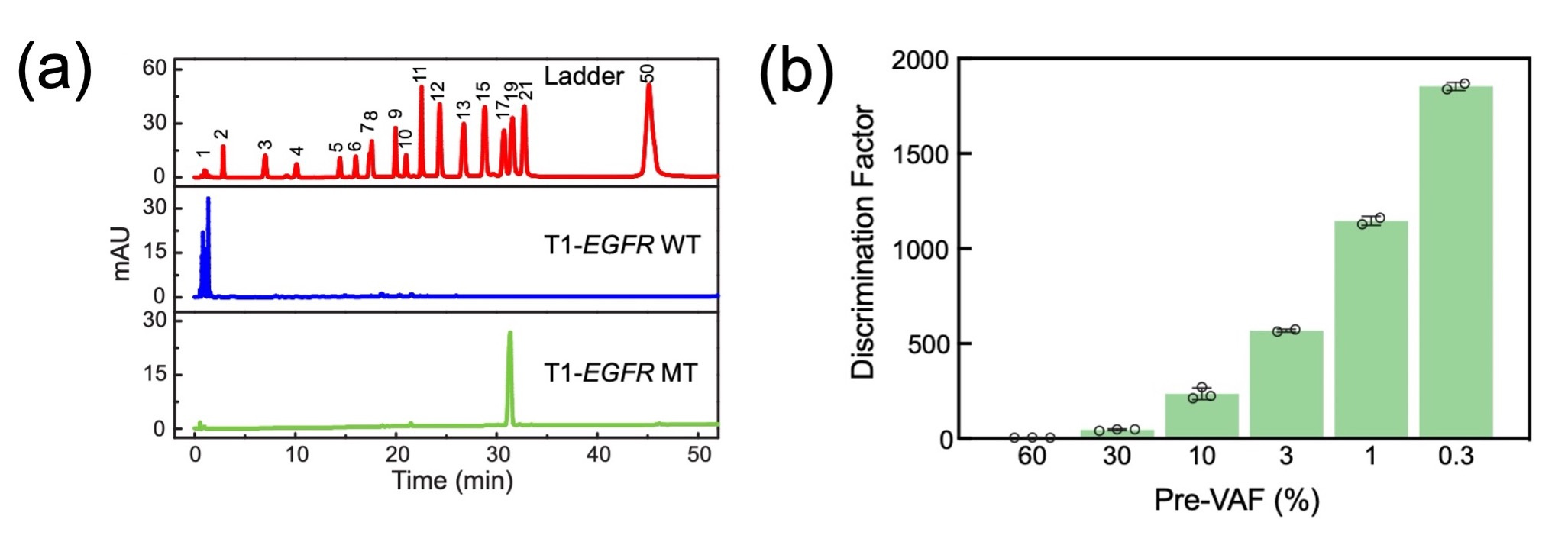 Proof of concept was established through the detection of the EGFR L858R mutation, a critical driver gene mutation in non-small cell lung cancer. Our sgDNase system, guided by S1-EGFR sspDNA, demonstrated exceptional single-nucleotide discrimination capabilities, achieving a discrimination factor (DF) of 166. The single-nucleotide resolution was confirmed through High-Performance Liquid Chromatography (HPLC)(Fig. 2a).