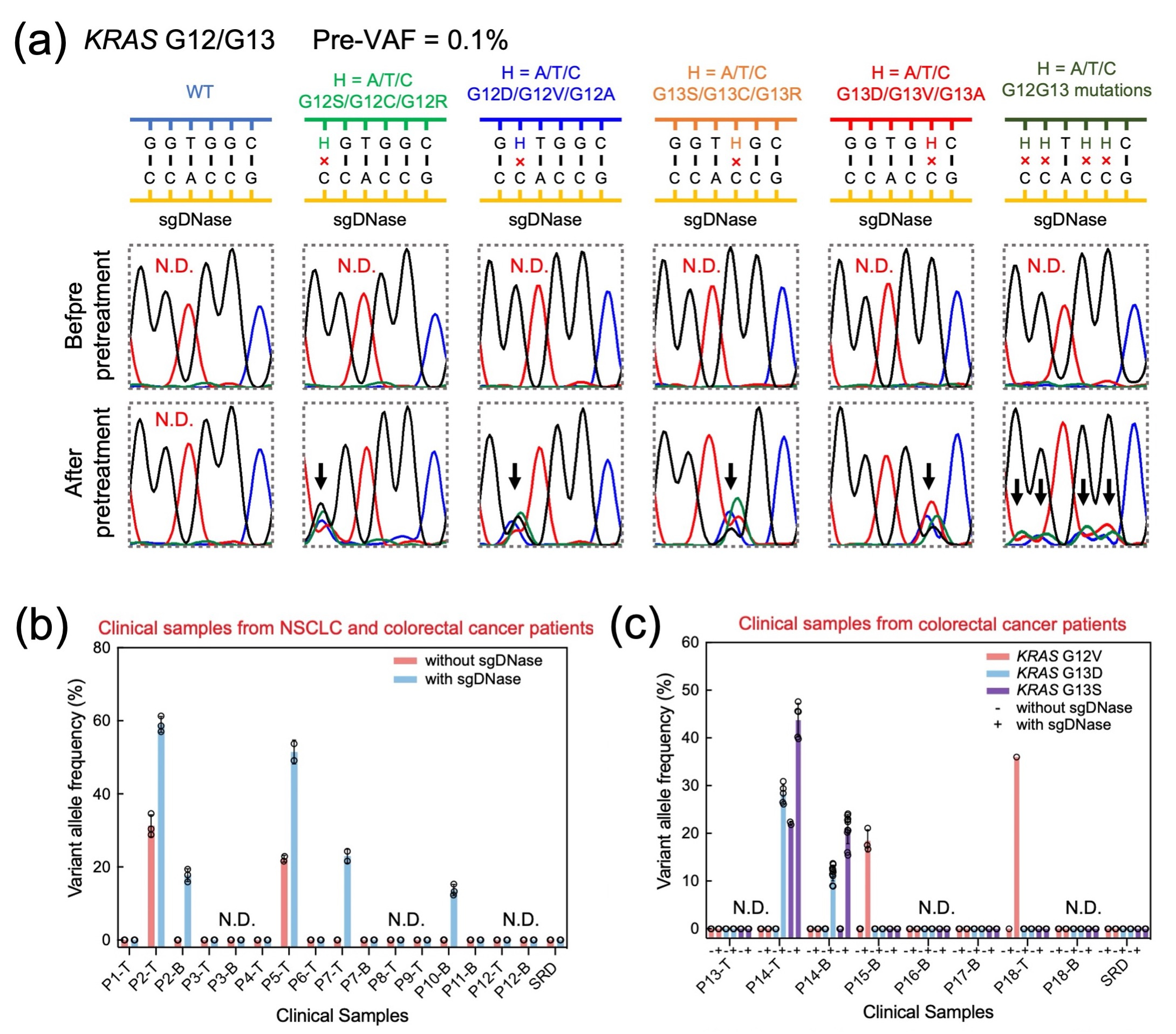 Fig. 3 (a) Comparison of Sanger sequencing chromatograms of synthetic KRASG12G13 samples (flora text for G12S, G12C and G12R; blueberry text for G12D,G12V and G12A; tangerine text for G13S, G13C and G13R; maraschino text for G13D, G13V and G13A; and moss for their combinations) with pre-VAF at 0.1% before and after sgDNase pretreatment. The curves in different colours represent different nucleotides (blue for C, black for G, red for T and green for A). The elevated mutation level after pretreatment is indicated by a black arrow above the corresponding chromatographic peak. (b-c) Detection of ultra-low-abundance mutations in clinical biopsy samples with sgDNase pretreatment. (b) sgDNase applied to 16 cfDNA and gDNA samples from eight NSCLC patients (P1–P8), four colorectal cancer patients (P9–P12) and standard reference DNA (SRD). P, T and B in the sample name represent patient, tissue sample (gDNA) and blood sample (cfDNA), respectively. (c) Rare mutation identification in KRAS G12/G13 residues in eight cfDNA and gDNA samples from six colorectal patients (P13–P18) and SRD using sgDNase-Sanger sequencing.