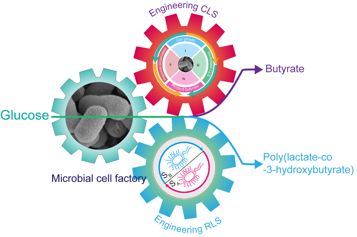 Fig. 1 Engineering Escherichia coli lifespan for enhancing chemical production. The RLS was fine-tuned using a two-output recombinase-based state machine to enlarge space for more poly(lactate-co-3-hydroxybutyrate) (inclusion body) accumulation. The CLS was modulated through a multi-output recombinase-based state machine to enhance butyrate production.