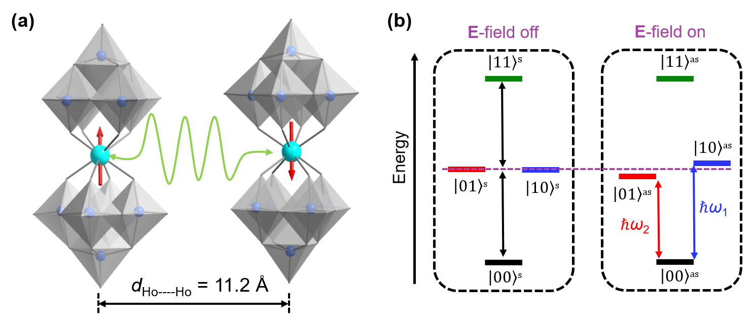 HoW10 is a polyoxometalate molecular anion whose spin-qubit dynamics are protected against magnetic noise at optimal operating points known as atomic clock transitions (CTs). However, for the same reason, they are insensitive to magnetic signals at those points. Moreover, the crystal unit cell contains two inversion-symmetry related HoW10 anions, which, when not at a CT, are coupled through weak dipolar interaction (Fig. a). In a recent collaborative work from our group on HoW10, experimental and theoretical study showed that one can achieve coherent control over the spin using an electric field pulse of modest strength to manipulate the CT frequency: Quantum coherent spin–electric control in a molecular nanomagnet at clock transitions DOI[10.1038/s41567-021-01355-4]. This is realized in practice due to a strong spin–electric coupling (SEC), which arises from intrinsic symmetry breaking, a soft and electrically polarizable environment of the spin carriers, and a spin spectrum that is highly sensitive to distortions. The inversion-symmetry in the crystal allows us to selectively address the spins of otherwise identical HoW10 molecules based simply upon the fact that they are pointing in opposite directions, and thus are distorted in different ways by an electric field.