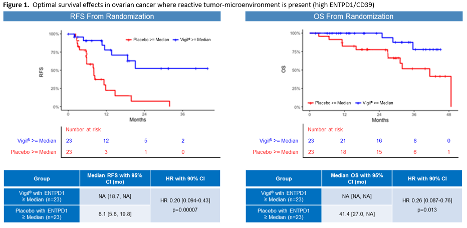 Work leading to the demonstration of ENTPD1/CD39 as a relevant biomarker of response of ovarian cancer patients undergoing treatment with Vigil in the VITAL study [1] goes back 10 years. Vigil is a novel platform technology designed to activate 3 anticancer immune mechanisms at once (immune functional enhancement, silencing of cancer suppression, clonal neoantigen exposure) [2]. We have known for some time that GMCSF protein functionally enhanced anti-infectious and cancer (to a lesser degree) immune response, but when intracellularly expressed via plasmid transfer to autologous cancer cells, it facilitated MHC expression of neoantigens. However, clinical trials exploring GMCSF plasmid immunotherapy were limited in demonstrating clinical response. One explanation for the limited response was thought to be related to cancer produced immune suppression cytokines (i.e., TGFβ1, TGFβ2). Another independent cellular (autologous tumor) technology generating knockdown of TGFβ2 via antisense technology separately demonstrated enticing clinical response data and conducted a registration trial in non-small cell lung cancer. Unfortunately, the primary endpoint was not achieved in part possibly related to limited anticancer functional immune enhancement. Our rationale for Vigil was conceived in part from the concept that if anticancer functional enhancement with GMCSF or silencing of tumor suppressive activity with inhibition of TGFβ individually was insufficient for clinical commercial justification separately, then the combination of these immune functional activities along with provision of relevant cancer neoantigen stimulus (via irradiated autologous tumor tissue) may achieve sufficient anticancer activity. We considered that knockdown of furin, the proprotein convertase required for export/secretion of TGFβ1 and TGFβ2 may provide intracellular control of both TGFβ1 and TGFβ2 export by tumor cells [3]. In vitro testing was done using a newly discovered proprietary bifunctional short hairpin RNA interference plasmid technology targeting the furin expression which demonstrated a robust inhibition of TGFβ1 and TGFβ2 secretion [4]. We constructed a dual plasmid that expressed both wildtype GMCSF and bi-shRNAi-furin for engineering transfected cells to produce GMCSF and to inhibit excretion of TGFβ1 and TGFβ2, respectively. We inserted (via electroporation) this dual plasmid into each patient’s surgically harvested autologous malignant cells to preserve relevant (personal) neoantigen targets and to create a triad of anticancer immune activity. We initiated a Phase 1 trial and successfully demonstrated an optimal dose, remarkable safety and predicted immune response (ELISpot assay) in correlation with clinical benefit [overall survival (OS)] [2, 5]. We then initiated Phase 2a testing of Vigil as a maintenance treatment in patients with newly diagnosed Stage IIIb-IV resectable ovarian cancer. Relevant cytokine expression (GMCSF↑, TGFβ1↓, TGFβ2↓) and ELISpot confirmed the mechanism of action in all Vigil treated patients compared to no change in controls. Moreover, relapse free survival (RFS) was shown to be significantly better in Vigil treated patients compared to control patients not receiving Vigil [6, 7]. After discussion of these results with FDA, CBER, we moved forward with Phase 2b testing in the same ovarian cancer population as entered into the Phase 2a study. Results in the randomized placebo controlled Phase 2b VITAL study involving 91 patients (47 Vigil vs. 44 placebo) confirmed safety and suggested benefit in both OS and RFS in the BRCA-wt [1] and HRP molecular profile positive subpopulations [8, 9]. Moreover, the effect appeared durable with continued significant separation in Kaplan Meier curves for both RFS and OS at 3 year follow up [9]. As part of our program, we have studied molecular biomarkers that may relate to sensitivity or resistance of Vigil. We found no relationship of Vigil response to tumor mutational burden or PD-L1 expression but with use of NanoString analysis and the NanoString PanCancer Immuno-Oncology 360™ CodeSet using the nCounter SPRINT platform (NanoString Technologies, Seattle, WA) and assistance from Dr. Rodney Rocconi at University of Alabama, Birmingham we studied correlation to RFS and OS benefit to determine an optimal biomarker of sensitivity. Genes that were significant for both RFS and OS advantage at the 1% significance level were identified. The Cox proportional hazards model with interaction term for each gene identified in the univariate Cox model was used to identify genes that were predictive of response to Vigil by analyzing data of both Vigil and placebo patients. The Cox model included the treatment groups, gene and treatment-by-gene interaction term. The model was run using the gene as a continuous variable or using binary high or low gene assignment. The median gene value for all 91 patients was calculated for each of the 750 cancer expressive pathway genes. Further model selection was also performed using a multivariate Cox model. We also used the my.stepwise.coxph function in R (open source, R Core Team), which employed both forward selection and backward elimination methodology. One gene of significance of the 750 tested that was identified using our NanoString Statistical Algorithm (NSA) was ENTPD1/CD39. ENTPD1/CD39 is a plasma membrane protein that hydrolyzes extracellular ATP and ADP to AMP and functions as a master regulator to maintain the balance between proinflammatory and immune suppressive regulatory function within the cancer microenvironment. It controls the rate limiting step in the conversion of ATP to ADP [10]. Vigil treated patients with high (> median) ENTPD1/CD39 (Figure 1) demonstrated markedly improved RFS over high ENTPD1/CD39 patients receiving placebo regardless of HRP status (p=0.00007), OS results demonstrated similar benefit (p=0.013). Further analysis suggested continued or enhanced advantage
