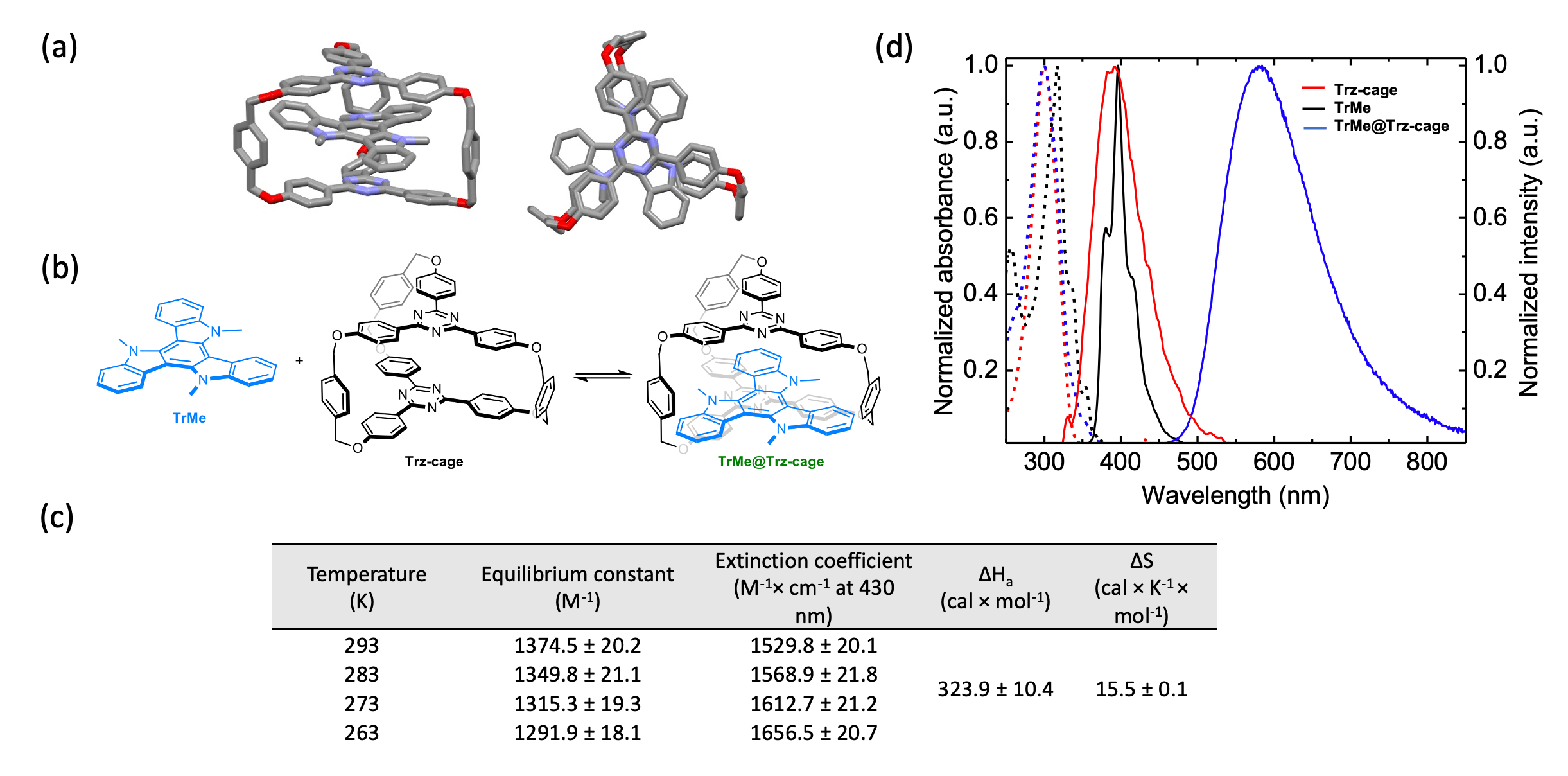 Next, we chose a triazatruxene-based molecule TrMe as donor guest to form donor-acceptor inclusion complex (D@A) with Trz-cage, namely TrMe@Trz-cage. The TrMe@Trz-cage complex structure is fully characterized by X-ray crystallography (Fig. 2a), and the emission spectra of TrMe@Trz-cage measured in DCM show an obvious exciplex emission around 500 nm to 700 nm (Fig. 2d). The various absorption titration experiments (Fig. 2b-c) indicate the TrMe@Trz-cage formation is an entropy-driven process, which could be rationalized by the desolvation of solvent molecules from the Trz-cage cavity that can provide a favourable entropic change. This entropy-driven process plays a crucial role in generating TrMe@Trz-cage exciplex emission.