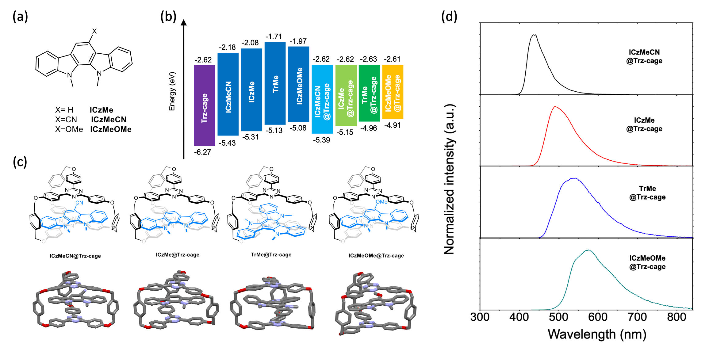 Last, we prepared the other three indolocarbazole-based donor guests with various donor strength to afford a series of new inclusion complexes, ICzMeCN@Trz-cage, ICzMe@Trz-cage and ICzMeOMe@Trz-cage, for which the associated crystal structures were also solved (Fig. 4a-c). Importantly, the exciplex emission of the three cocrystals can be fine-tuned to 441, 491, and 575 nm, respectively, as compared to that of TrMe@Trz-cage at 542 nm, generating a broad spectrum of exciplex by using the cage-like Trz-cage unit (Fig.4d). In addition, except for ICzMeCN@Trz-cage, the exciplex emission of all the complexes exhibit intense TADF properties.
