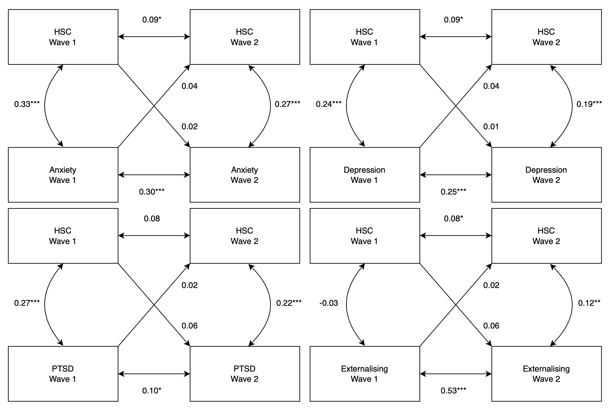 Figure 3: Cross-lagged panel models revealed no strong correlations between self-reported sensitivity, using the Highly Sensitive Child (HSC) scale and mental health outcomes such as anxiety, depression, post-traumatic stress disorder (PTSD) and externalising behaviour.