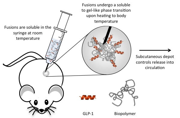 GLP-1 is an ideal candidate for a controlled-release system to treat type-2 diabetes. In contrast to insulin, which can cause severe hypoglycemia if present when it is not needed, GLP-1 is glucose-dependent. Dr. Amiram had synthesized a fusion of GLP-1 to a thermally sensitive biopolymer and, while a single injection worked well for five days in pre-diabetic mice, its efficacy in diabetic mouse models was disappointing, lasting only 2–3 days.