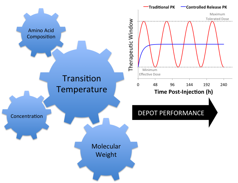 About a month into my PhD, we had a meeting with my advisor, Prof. Tosh Chilkoti, to discuss a hypothesis. Perhaps we would see better efficacy if we created a stronger depot, one that underwent its soluble to gel transition further below body temperature. I set off cloning fusion after fusion, keeping the number of biopolymer units the same while adjusting the composition to yield fusions with transition temperatures (Tts) spanning 15 to 60 °C. In treating mice with these constructs, we discovered that our hypothesis was correct: lowering the Tt did indeed yield more stable depots. However, these depots performed worse because they released too little drug over time. In fact, the fusions transitioning just below the subcutaneous temperature of mice demonstrated the greatest efficacy. We wondered how much we could continue improving the drug’s activity with further optimization.