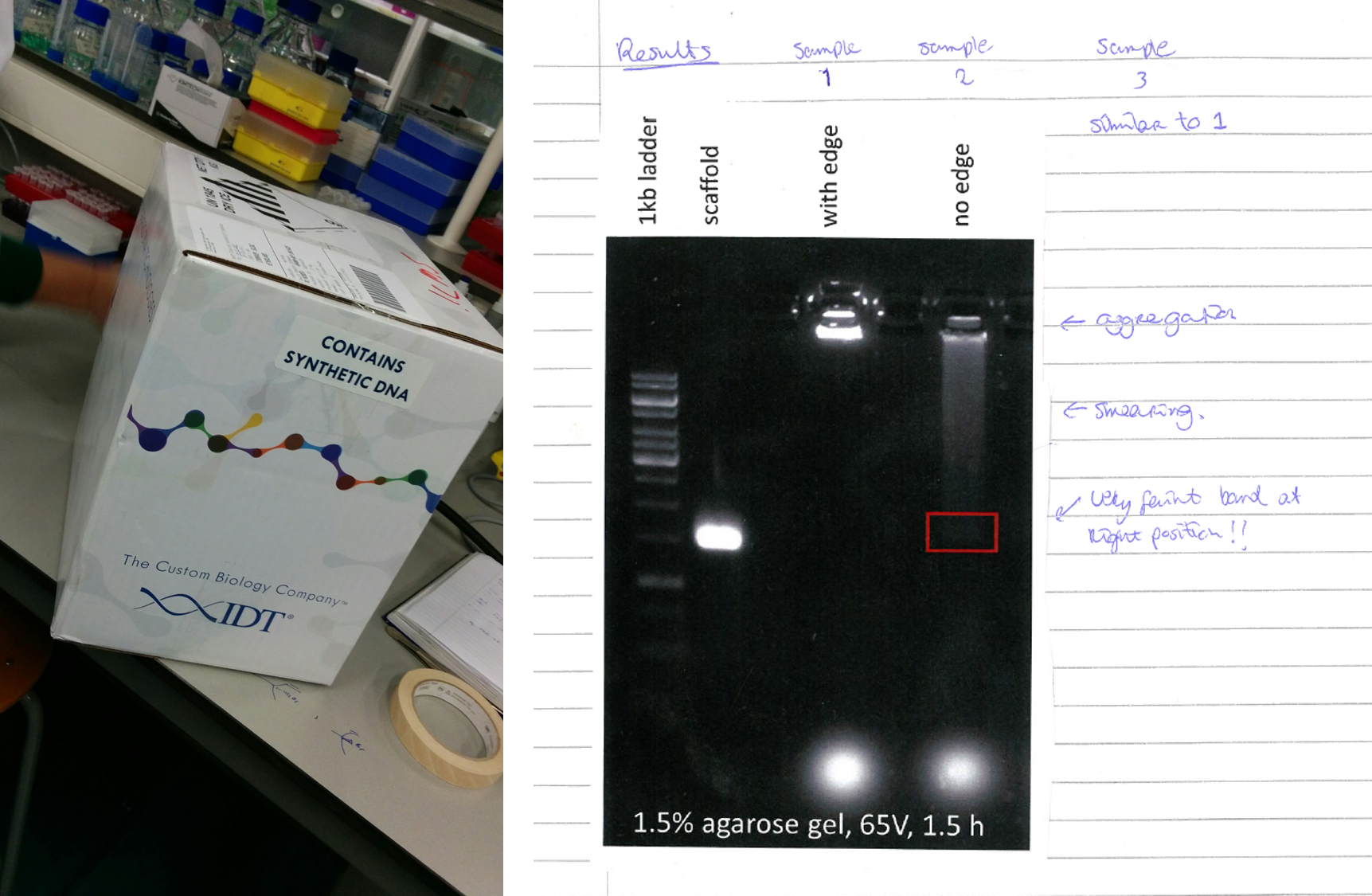 The nanoscale platform was constructed using the DNA origami technique, which I was introduced to during my internship in the lab of William Shih, a pioneer and expert in the field. The DNA I ordered arrived in a big box just before the holidays in 2014, and I folded—well, tried to fold—my first batch of DNA origami soon after.