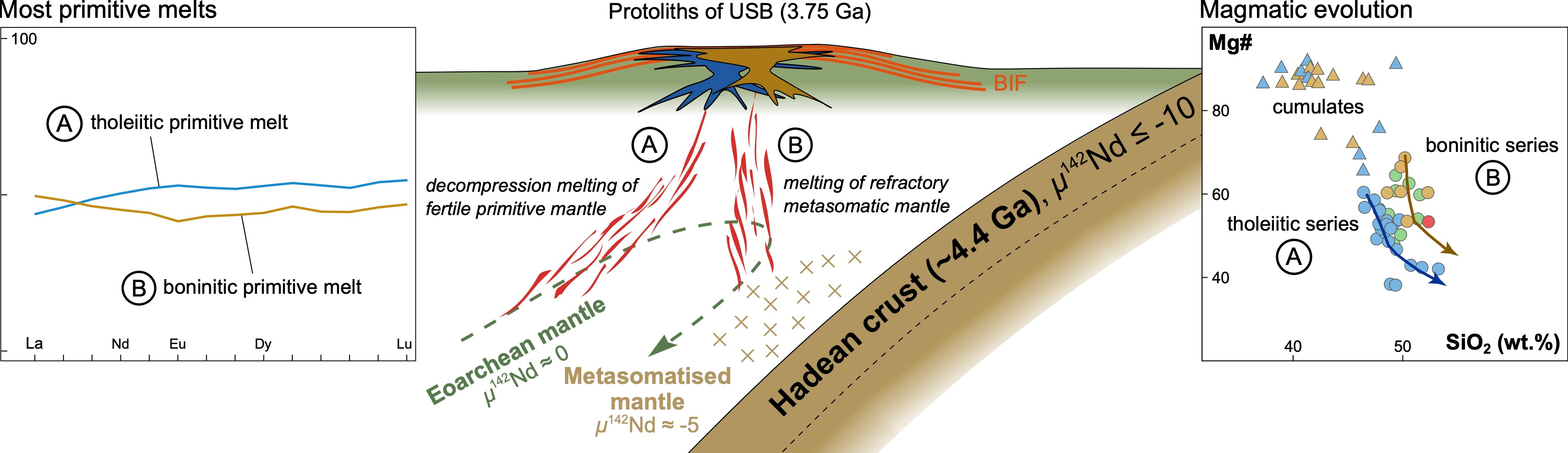 Our work also modelled the melt evolution of these two suites considering the two most primitive melts and the crystallising assemblages inferred from observations and bulk rock compositions (Figure 2). This led to the elucidation of a typical damp tholeiitic sequence dominated by clinopyroxene and plagioclase, and a boninitic suite crystallising orthopyroxene, plagioclase, and amphibole. We then coupled these findings with a previous study showing that some mafic rocks, and especially the boninitic melts, have preserved a 142/144-neodymium isotope anomaly which coincides with the damp and wet character of the tholeiitic and boninitic suites, respectively. At this point, we just need the mantle source of the boninitic melts to be wet, while the primary tholeiitic melts remain damp, but how? Regardless of the geodynamic regime, water must be recycled into the mantle. Based on our observations, it appeared to us that the easiest way to form damp tholeiitic and wet boninitic melts requires a horizontal component into the downgoing lithospheric portion, similar to subduction. This would allow the formation of a mantle corner flow leading to decompression melting of tholeiitic liquids, followed by the fluid intake of the descending lithosphere enabling fluid-assisted melting of a probably depleted mantle and, therefore, the genesis of boninitic melts. Alternatively, the vertical delamination of an overthickened crust could also produce such signatures, but it does not provide a direct pathway to producing usually-low-pressure boninitic melts. The main conclusion of our work is that Ukaliq rocks preserve geochemical signatures and 3,800-million-year-old crystals indicative of the type of magmatism operating then. Now that we know such rocks are preserved from these early times, it makes sense to expand our studies to reveal even more about how and when plate tectonics came to be.