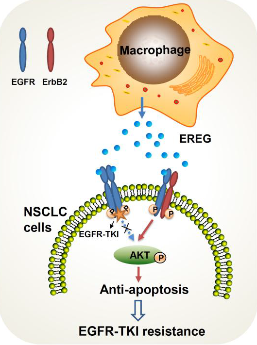 These results shed new light on the mechanism underlying EGFR-TKI resistance, and suggest macrophage-produced intratumoral EREG as a novel regulator and biomarker for EGFR-TKI therapy in NSCLC. These new findings lead patients to choose the proper EGFR-TKI treatment and provide a new way to overcome EGFR-TKI resistance, which may benefit NSCLC patients.