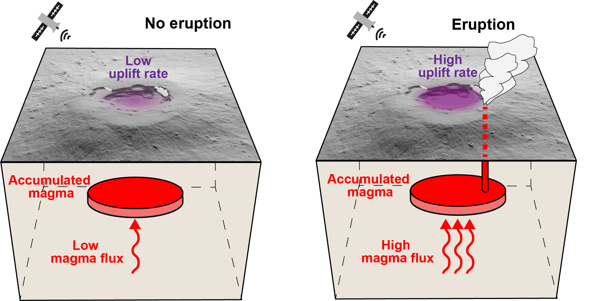 A research team from Italian, British and American institutions addresses these limitations in a scientific article just published in Nature Geoscience (https://www.nature.com/articles/s41561-022-00960-z), showing that a novel parameter, which can be indirectly measured at volcanoes, is a good indicator of whether it will erupt or not (Fig. 1). This precursor is the rate of magma injection within the volcano, derived from measurements of the surface deformation of the volcano from satellites. The rate of magma injection is directly related to the possibility to start propagating magma outside the magma reservoir, a necessary condition for having an eruption. The approach has been tested at some highly-active and frequently erupting type of volcanoes, those with calderas, which are wide volcanic depressions at the surface previously formed by the partial emptying of the magma chamber below. In particular, the precursor has been tested at calderas that erupt a very common type of magma, known as “basalt”.