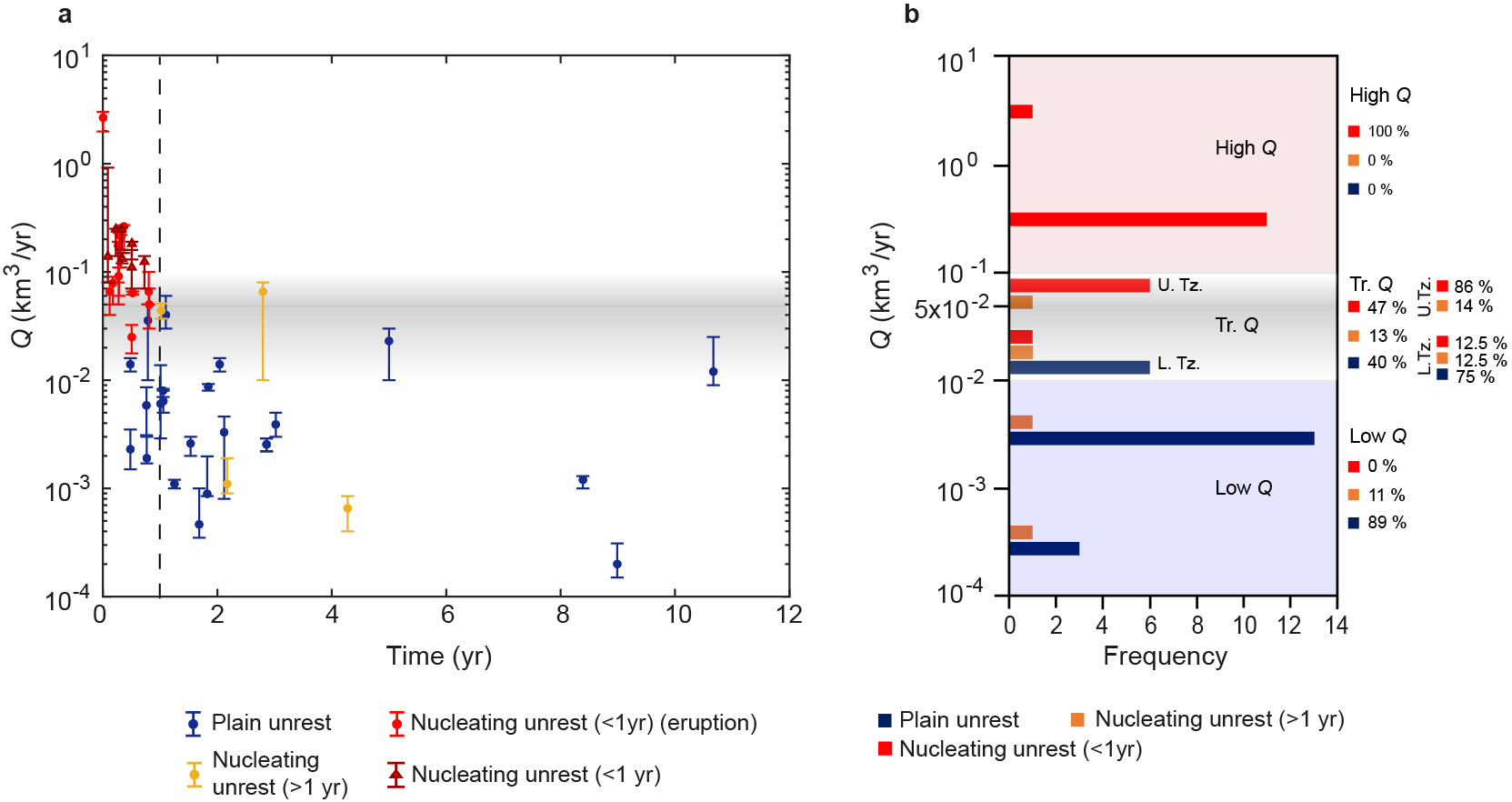 In particular, if the rate of magma injection below the caldera is high (≥ 10−1 km3 yr−1), eruption occurs within 1 year from the onset of the deformation in all the considered cases (nucleating unrest, Fig. 2); conversely, if the rate of magma injection is low (< 10−2 km3 yr−1), eruption does not occur for 89% of cases (Plain unrest; Fig. 2). Transitional behaviours are observed in between. For high transitional magma injection rates of 5–9 × 10−2 km3 yr−1 eruption occurs within 1 year from the onset of the deformation in the 86% of the cases, while for low transitional magma injection rates of 1–4.99 × 10−2 km3 yr−1 eruption does not occur in the 87.5% of the cases (Fig. 2).