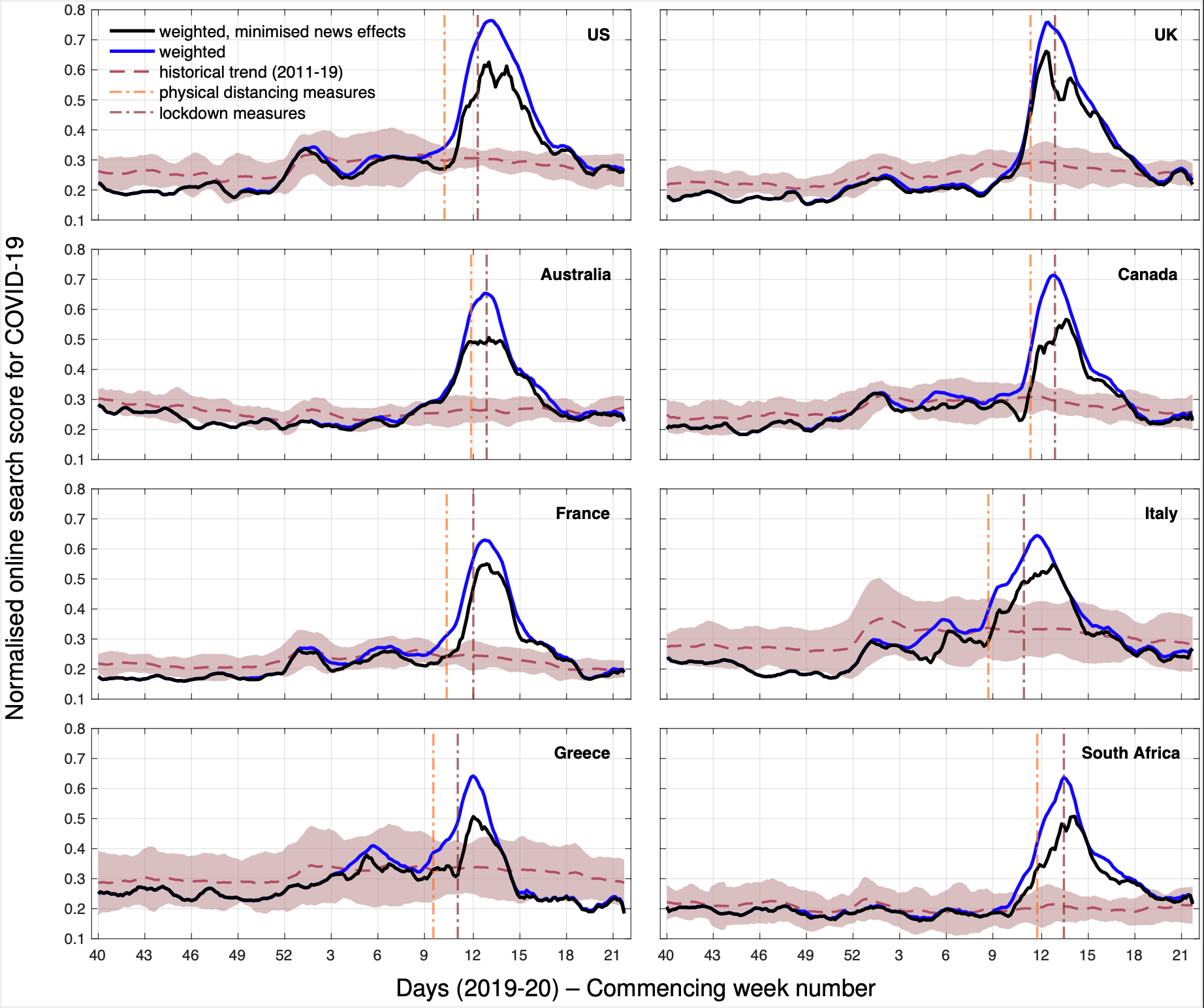 In our paper "Tracking COVID-19 using online search" published in npj Digital Medicine we show how Google search data can be used to develop complementary public health surveillance methods for COVID-19. We present results for a multilingual and multicultural selection of 8 countries: United States (US), United Kingdom (UK), Australia, Canada, France, Italy, Greece, and South Africa. Our analysis covers the period from October 2019 to the end of May 2020, i.e. the first wave(s) of the COVID-19 pandemic.
