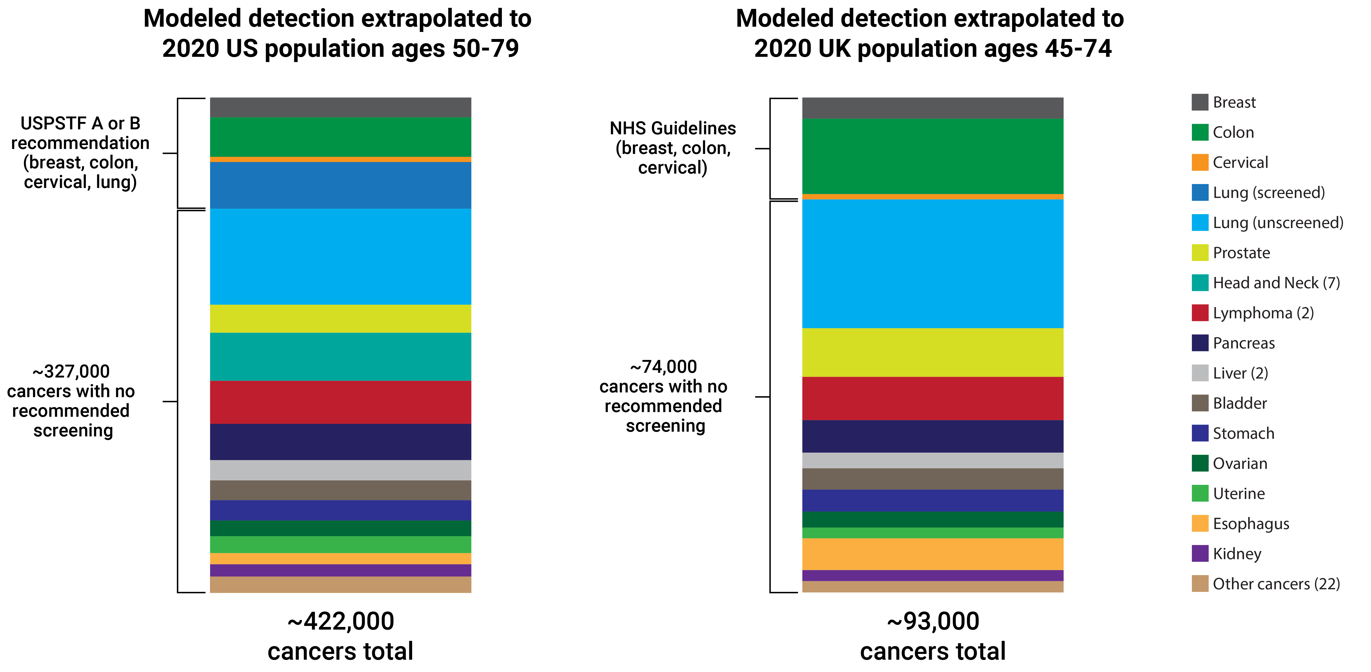 We examined two different healthcare systems, the United States and the United Kingdom, to estimate (by modelling) what current cancer screening achieves and then what impact adding an MCED test might have. As MCED tests are a new screening method, there are no real world data available yet, so our modelling was based on an earlier version of the commercially available Galleri™ test.1