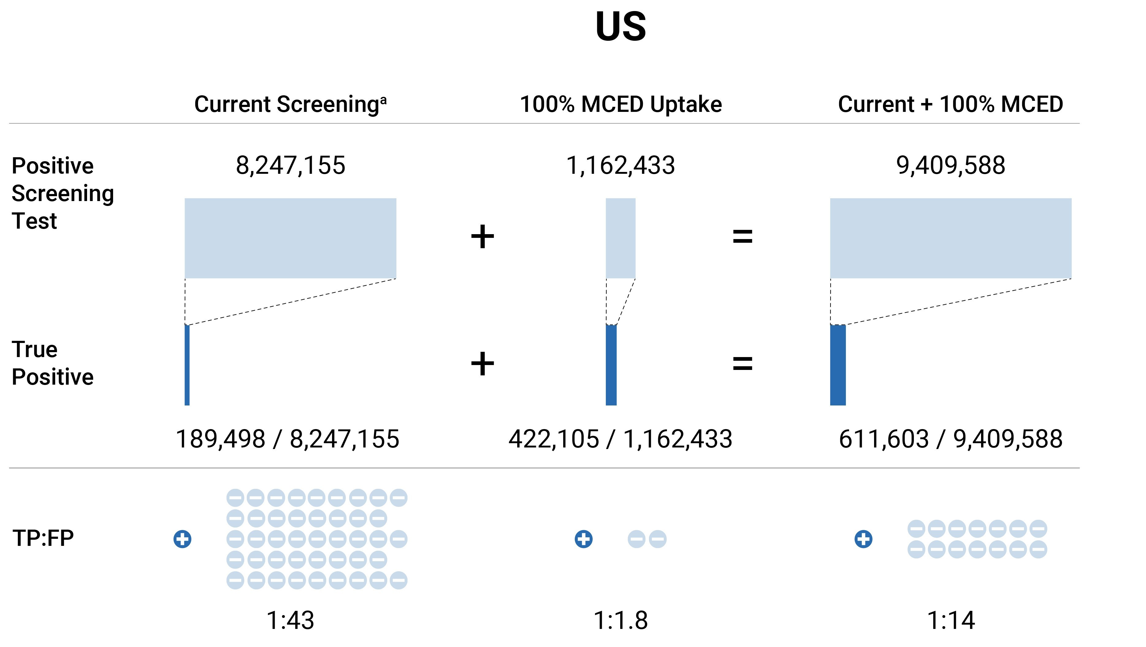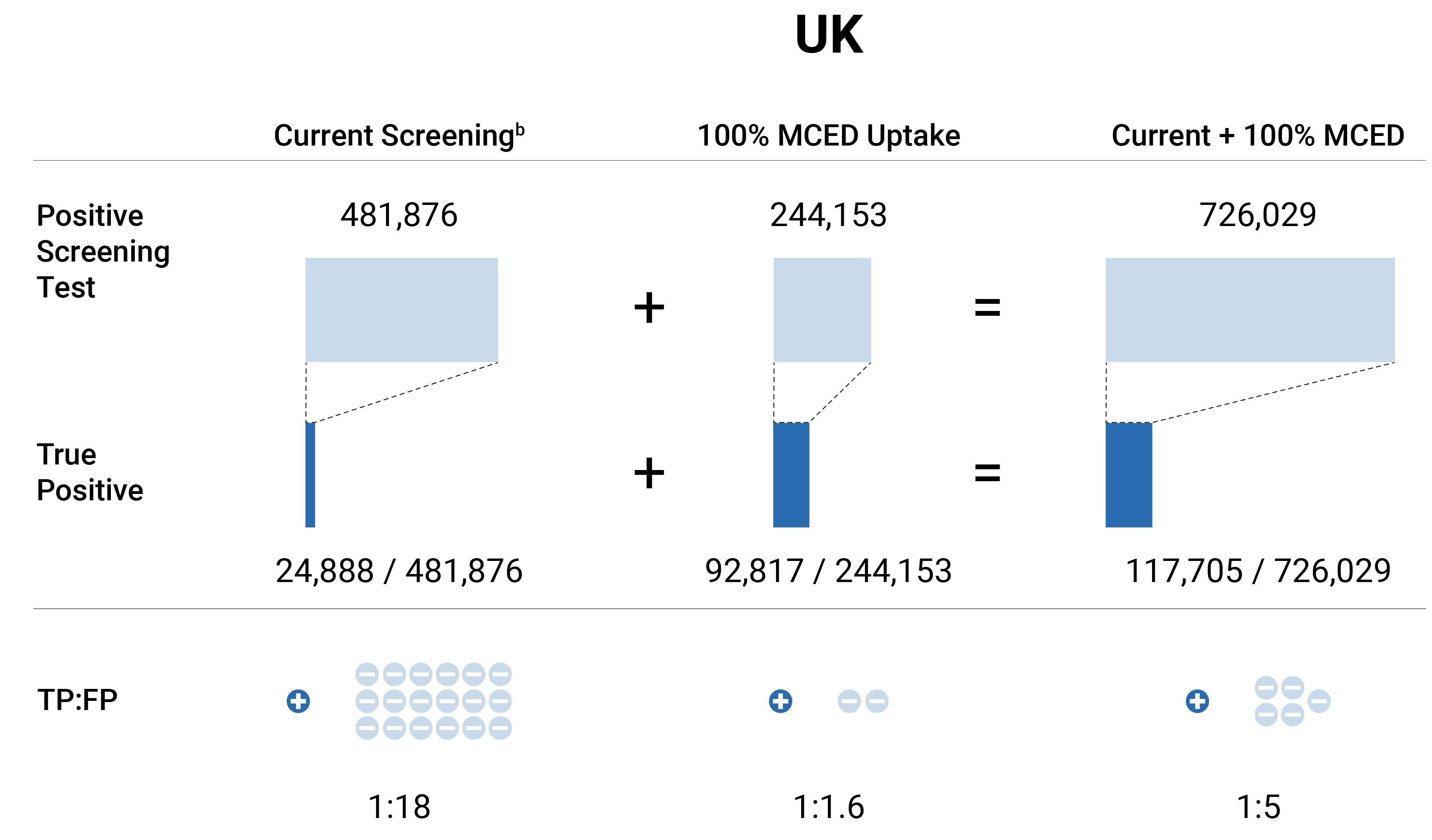 The top row of this figure shows, from left to right, the total number of people with a positive screening test result with current screening measures, the additional results with MCED testing (assuming 100% uptake), and the sum of these. The second row shows the number of people confirmed to have cancer after they have positive screening test results (true positive, TP). The last row (TP:FP ratio) depicts how many people without cancer (false positive, FP; light blue -) may be flagged for diagnostic investigations at a hospital or clinic in order to detect one person with cancer (TP; dark blue +), when they have a positive screening test. aCurrent screening in the US for breast, colon, cervical, and lung cancers. bCurrent screening in the UK for all cancer types.