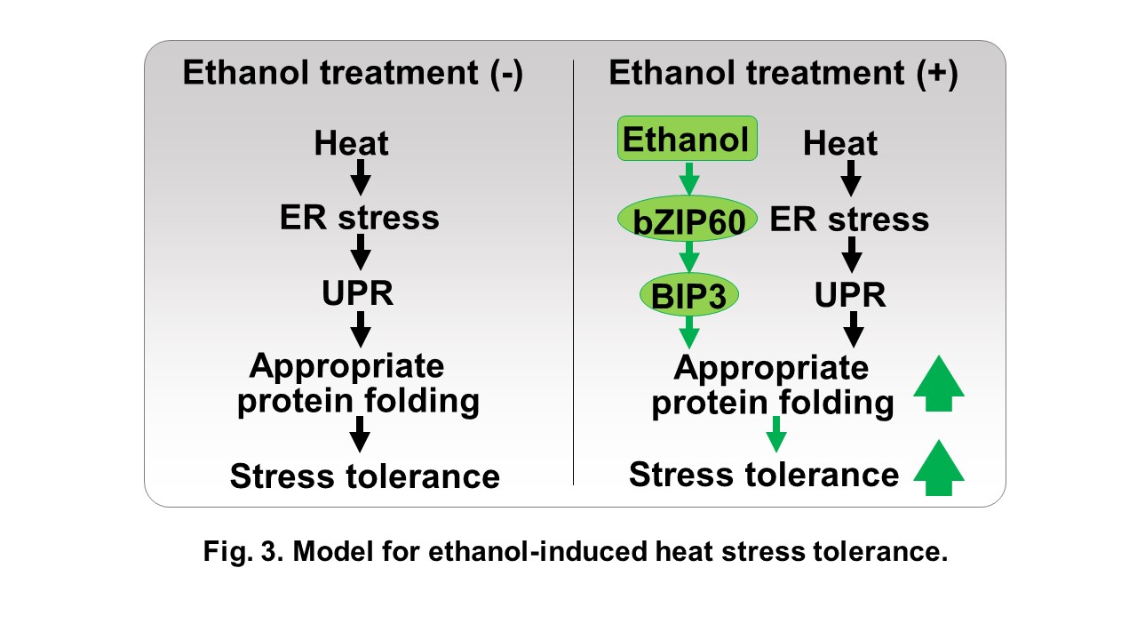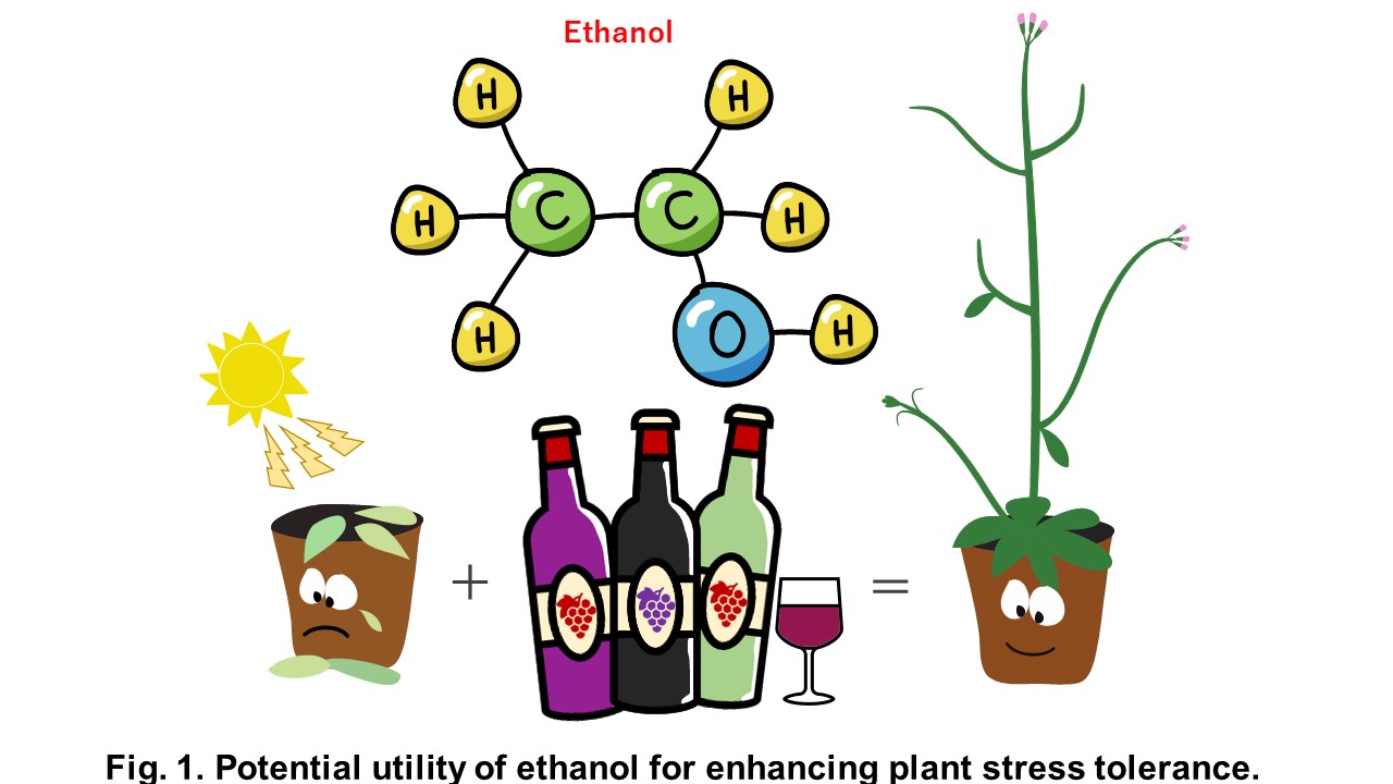 In this study, we demonstrated that a pretreatment with ethanol at a low concentration  (i.e., 0.12%, which corresponds to the alcohol content of 100-fold diluted wine) increases heat tolerance without suppressing plant growth (Fig. 1). Hence, this pretreatment represents a cost effective, simple, and environmentally friendly way to protect crops from the detrimental effects of global warming (Fig. 1).