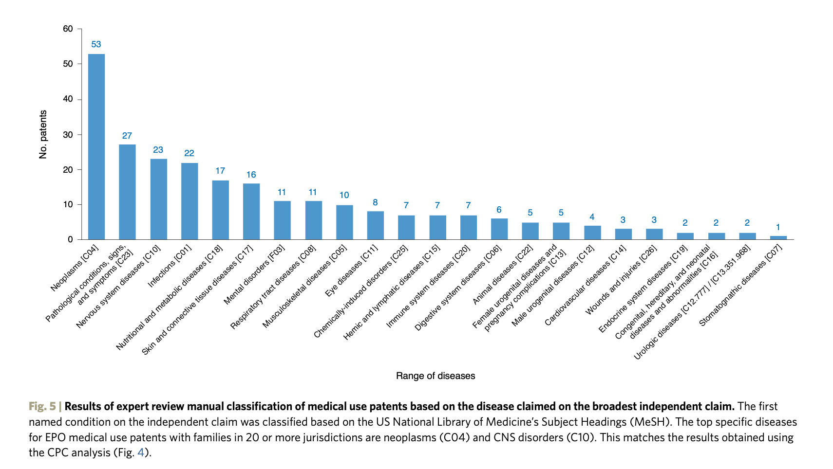 The top specific diseases for EPO medical use patents with families in 20 or more jurisdictions are cancer (MeSH C04) and diseases of the nervous system (MeSH C10). That said, our results show a broad coverage spanning a wide range of therapeutic areas.
