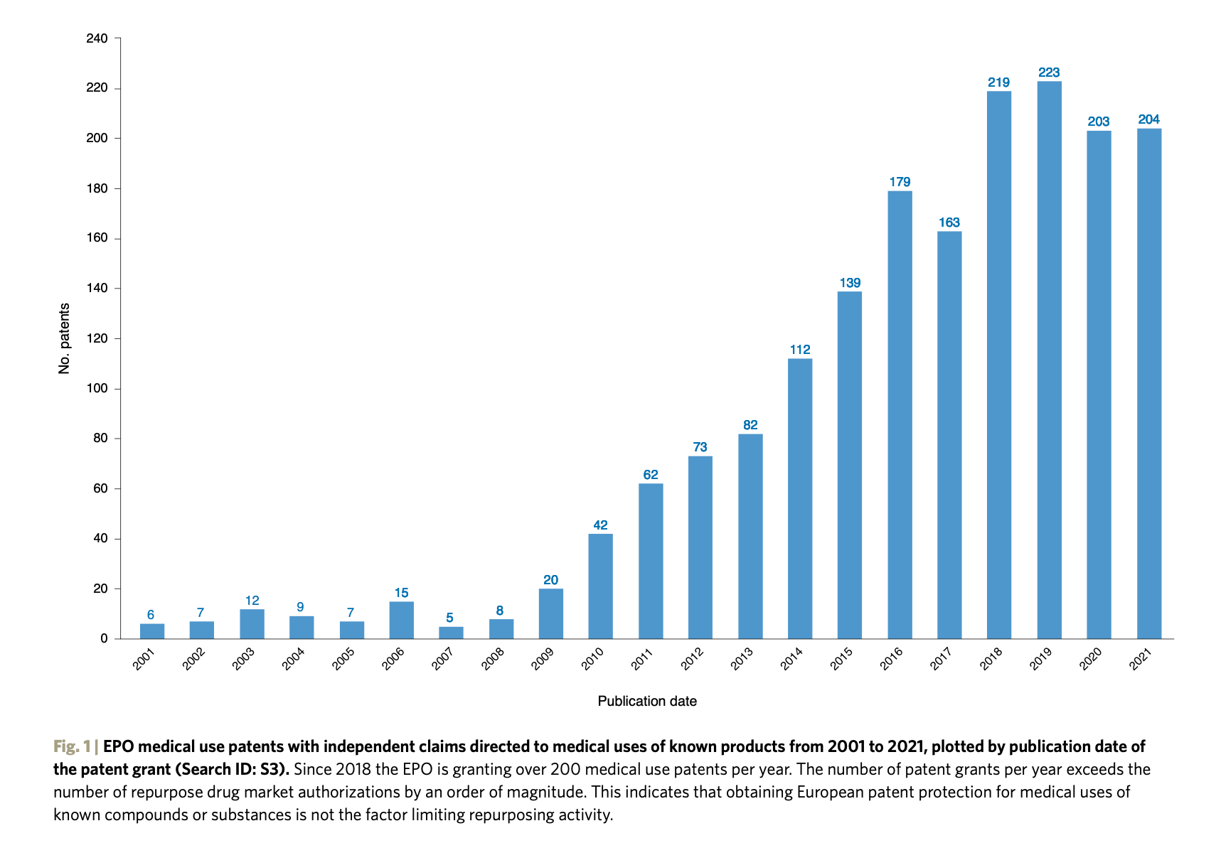 In summary, we find (i) an increasing number of medical use patents relative to the number of repurposed drug authorizations, (ii) a relatively high grant rate for medical use patents indicating a clear legal basis for subject matter eligibility, (iii) a diversity of patent owners obtaining these medical use patents (public and private), (iv) a diversity of jurisdictions where they are protected and (v) coverage over all the major therapeutic areas. These findings indicate that obtaining patent protection for medical use inventions at the EPO does not appear to be a major challenge, and it is not likely to be hindering drug repurposing.