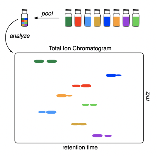 By using mass spectrometry (MS) as the detection method instead of UV, different products with unique masses can be pooled into one vial and analyzed together (Figure 1). Reactions are run normally, with one substrate per reaction vessel. When the reactions are complete, samples from multiple reaction vessels are combined into a single vial. Chiral supercritical fluid chromatography (SFC) is performed and then the enantioselectivity for each product is determined on its own mass channel. This trick works well even in complex mixtures, is accurate enough for screening work (±7% ee), and speeds up chiral analysis a lot.