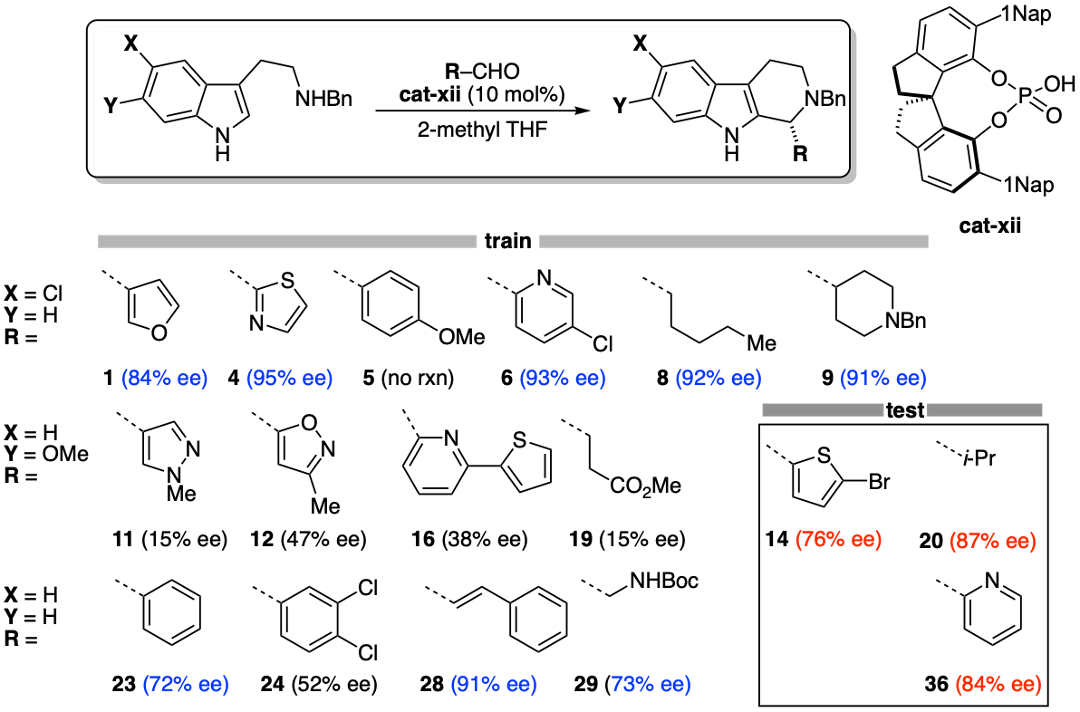 Reassuringly, this modified catalytic system generalizes to substrates that are outside the training set of 14 molecules. When we evaluated a test set of three substrates, we found that each substrate exceeded 70% ee. The fact that xii is exceptionally general was not detected by routine single substrate screening, and illustrates the potential of multi-substrate screening. Our method uses existing equipment and can immediately be used for the discovery of catalytic, asymmetric reactions with broad substrate scope.