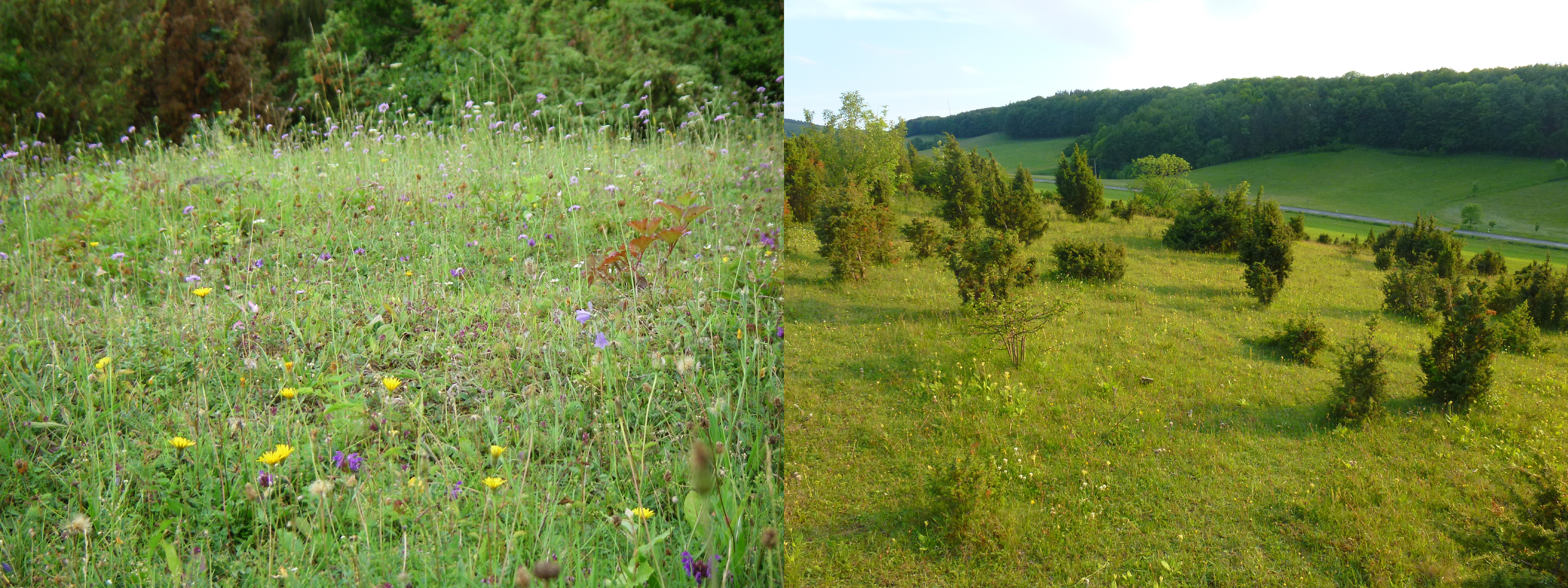 Left: Calcareous grasslands can be highly biodiverse. This becomes particularly evident when the grasslands are in full flower - this picture was taken in July during peak flowering. Right: Calcareous grassland fragment close to Göttingen, central Germany. On average, the calcareous grasslands in our study region declined by 50% in area since the 1960s. Declines are often driven either by agricultural intensification or abandonment - the latter due to the fact that these grasslands need constant, yet extensive, management by grazing or mowing to avoid succession of woody species, which, however, has become economically unattractive in many places.
