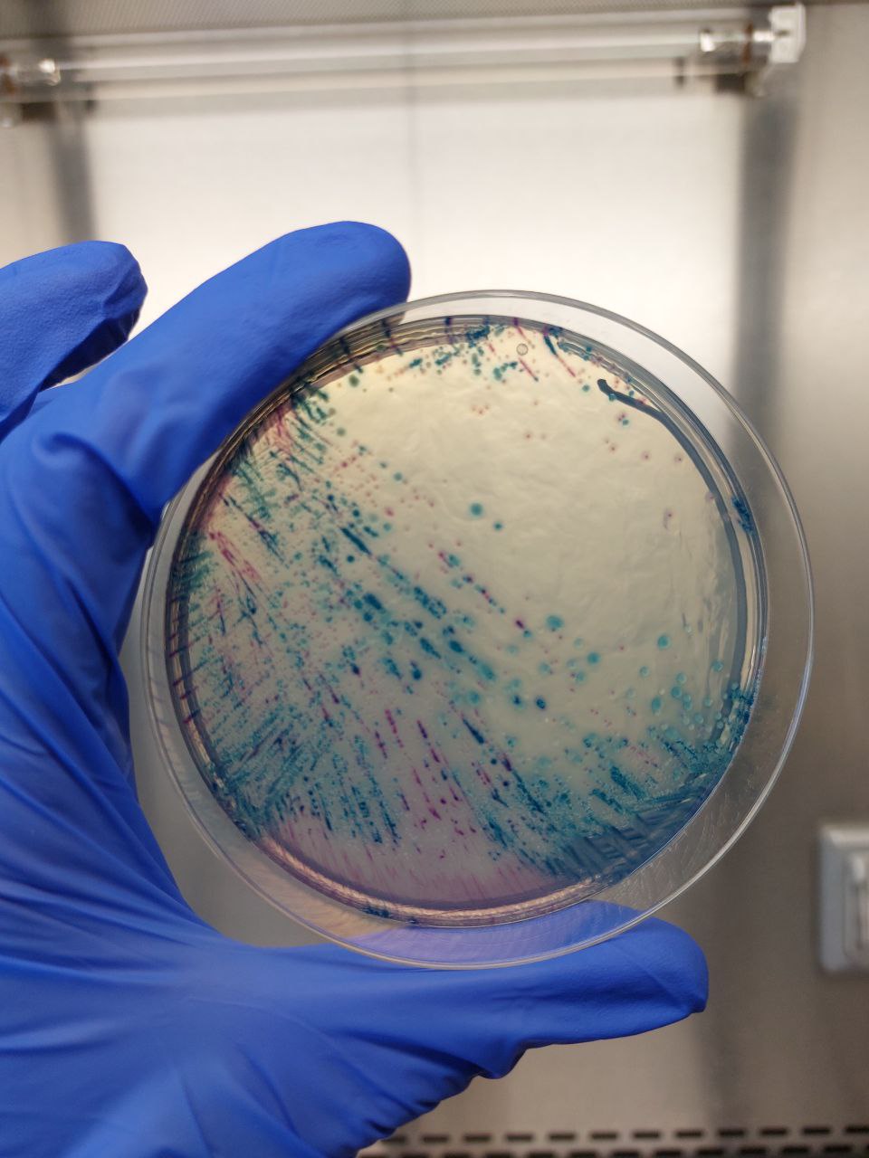 A differential medium agar plate containing multi-drug resistant Escherichia coli (red) and Klebsiella pneumoniae (blue) isolated from a single hospitalized patient.
