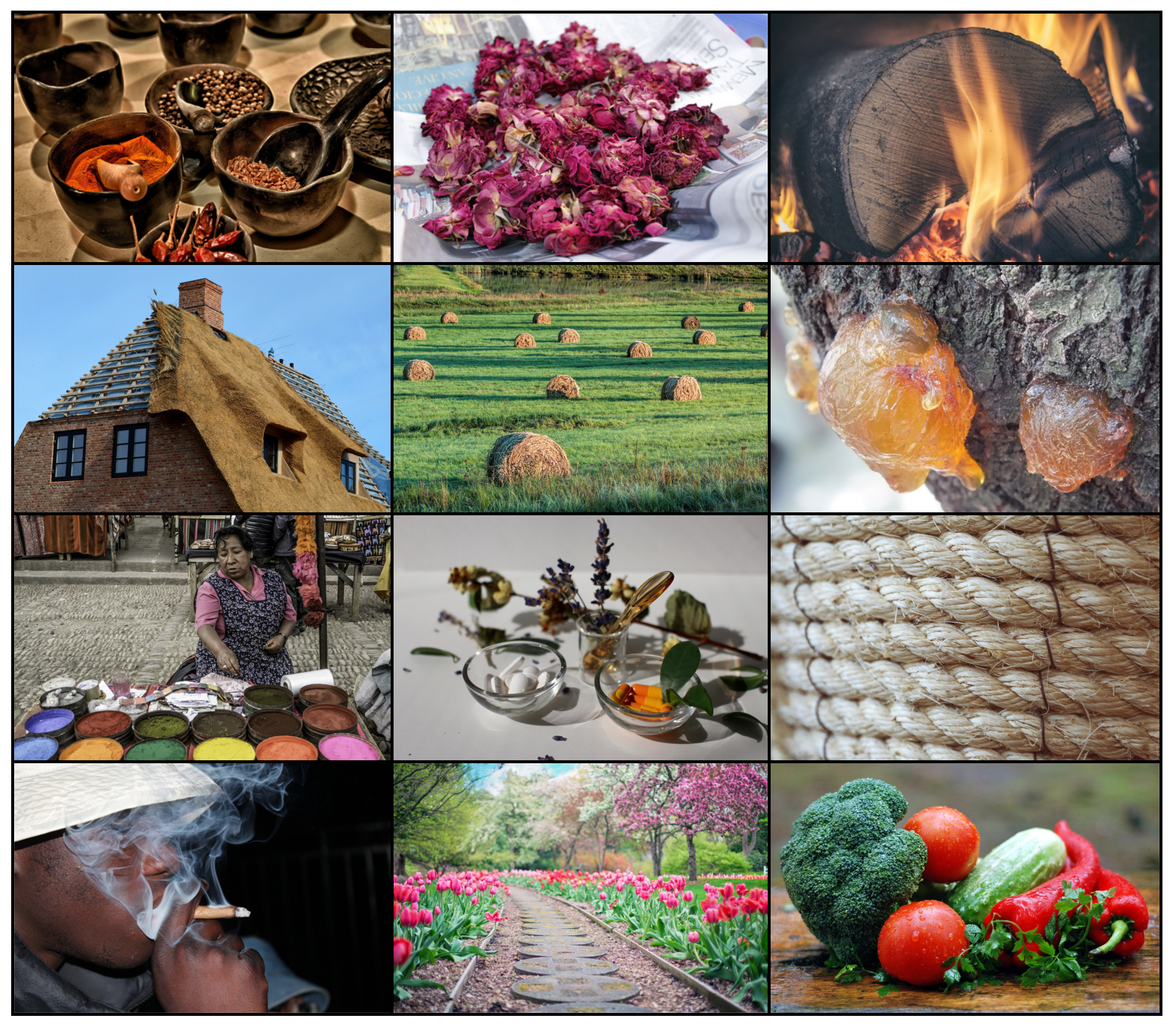 Figure 2. Some human benefits that are directly provided by plants. From top to bottom and left to right: food additives, scents, fuelwood, thatching materials, fodder, resins, dyes, medicines, fibers, smoking materials, ornamental display and food.