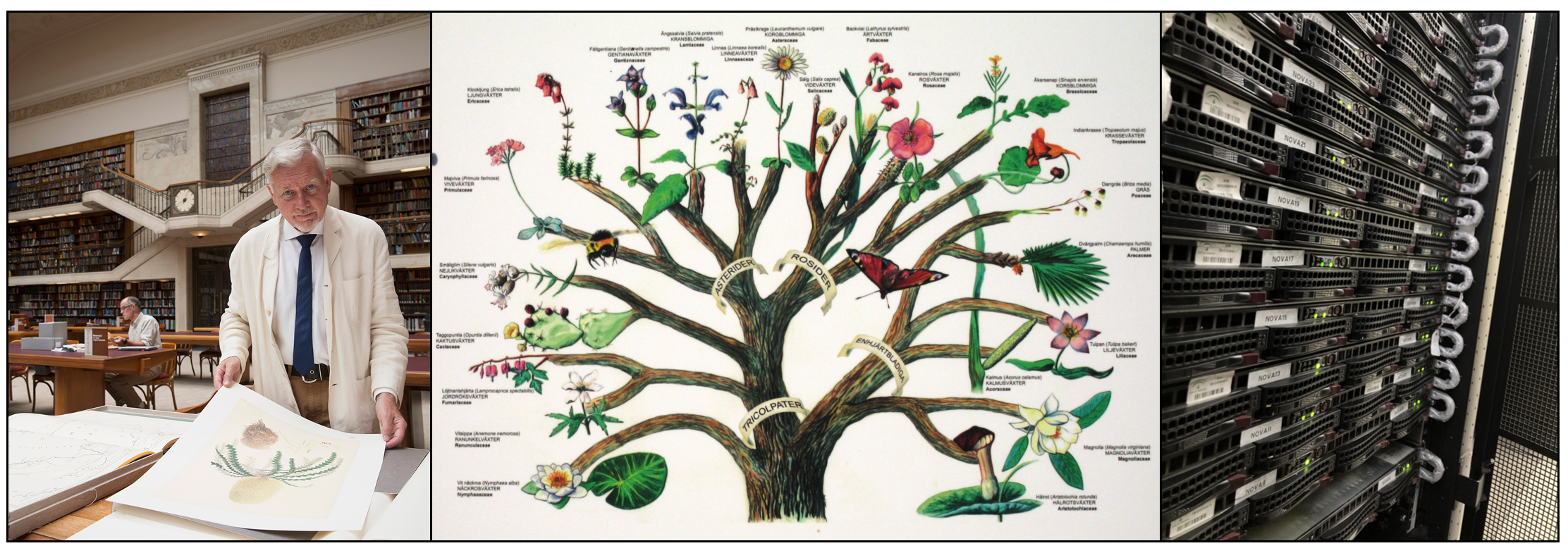 Figure 5. Left, Professor David Mabberley, co-author of the study and author of Mabberley’s Plant-book, examining a Ferdinand Bauer engraving in the State Library of New South Wales in December 2016 (Photo: M. Campbell; courtesy State Library of New South Wales, Sydney, Australia); middle, a representation of the plant Tree of Life (protected under Creative Commons license, see Third Party Material Information); right, detail of the High Performance Computing Cluster of Andalusia (Photo: P. Vázquez).
