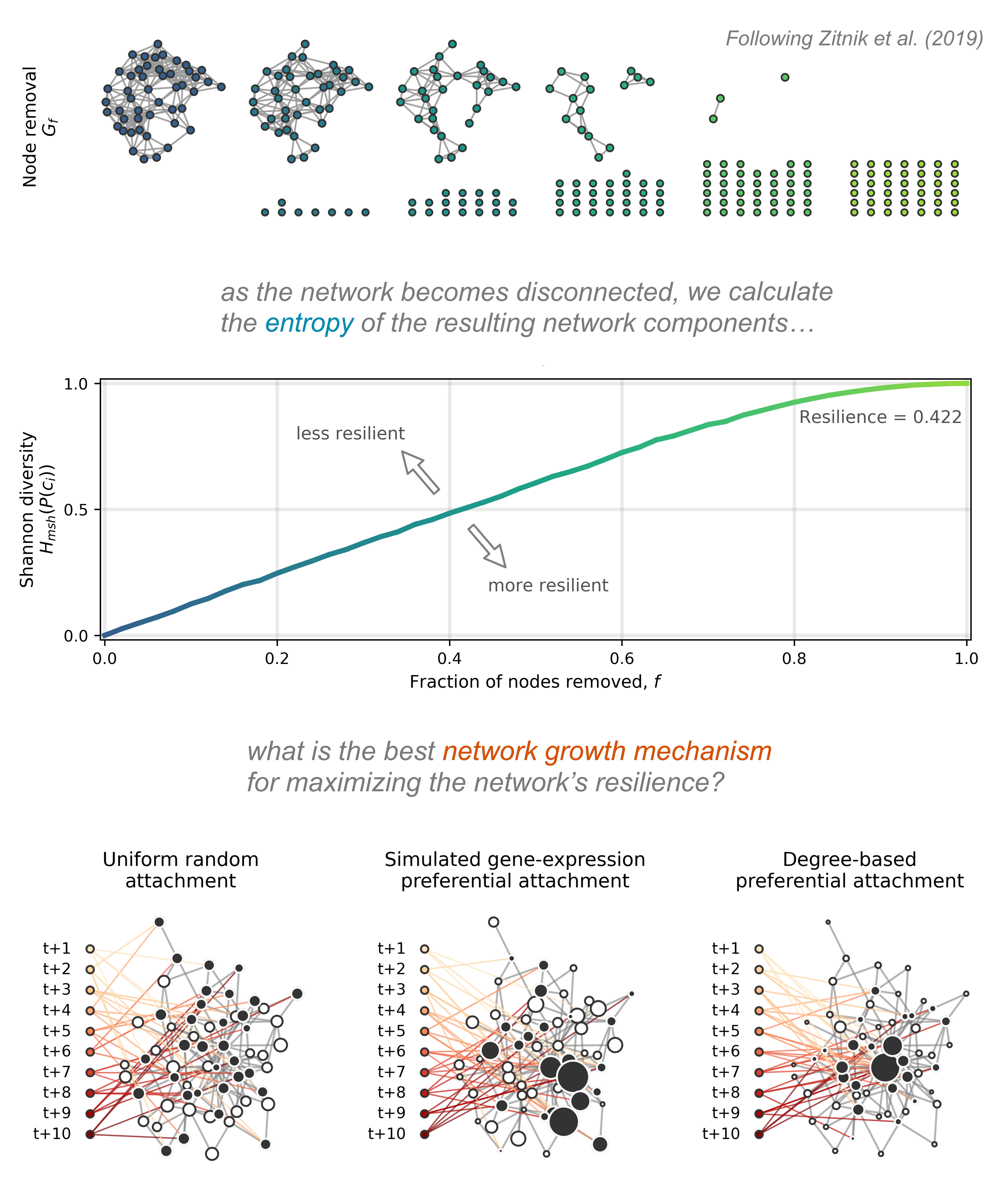 Network resilience—similar to the notion of biological redundancy and robustness—is defined here as tolerance towards perturbations. A resilient network can tolerate multiple perturbations, e.g. mutations that cause some loss of interactions, because high network redundancy implies that there are still plenty of connections despite demise in network connectedness. Previous work has quantified PPI network resilience by removing nodes and connections, and calculating the altered network resilience using a measure based on the Shannon index (see Figure 1) [4]. We built on this work by quantifying network resilience after adding nodes, which simulates how PPI networks may incorporate novel nodes (see Figure 1). We assume that novel proteins can be integrated into existing PPI networks if they do not cause the network to become disconnected, and instead add to the network resilience. We call this the prospective resilience, and we study it using three different node addition mechanisms.