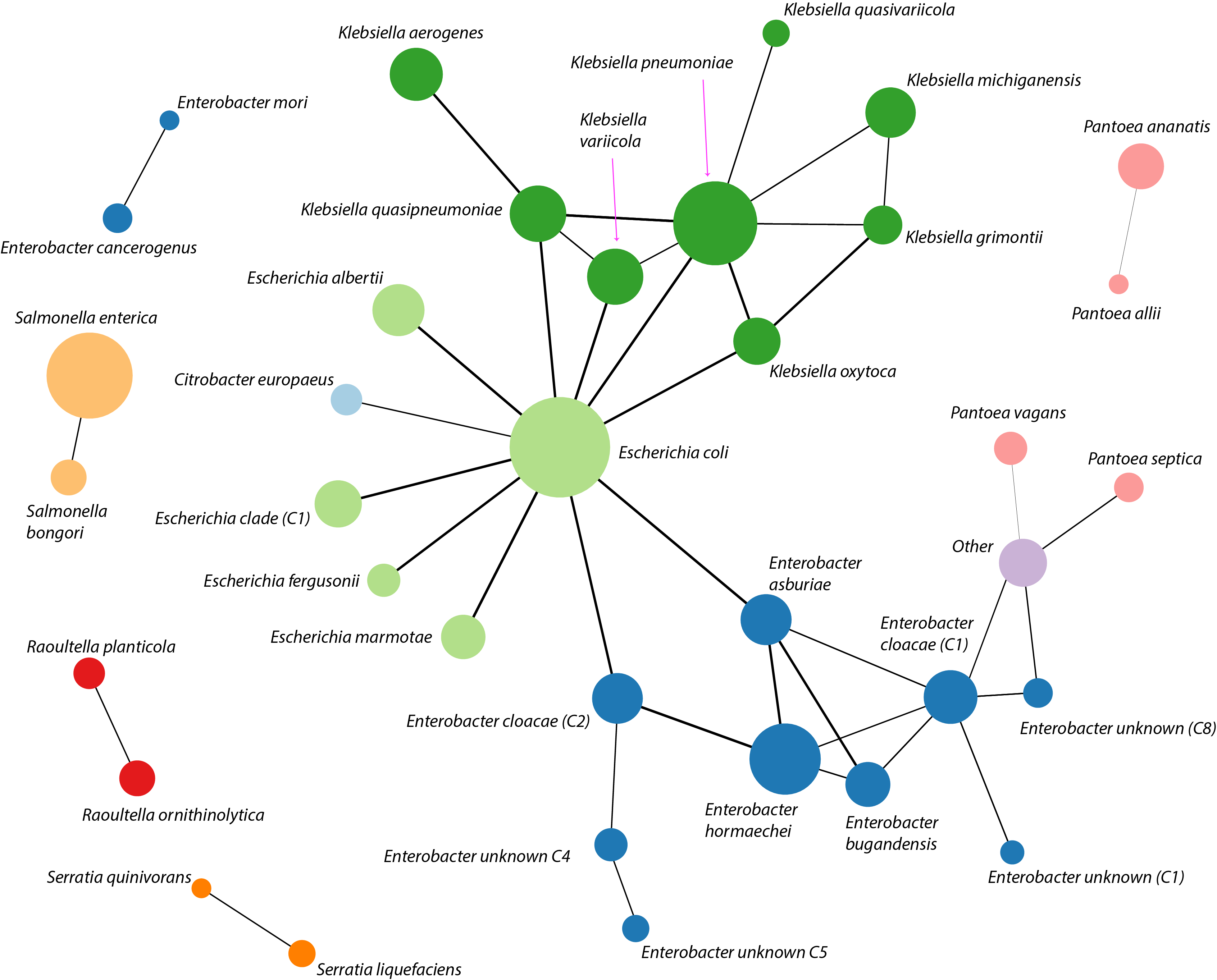 Figure. Impact of HGT on exchange of bacterial surface polysaccharides (SPs) between species and genera in. Each node of the network shows a species and edges link those species which were found to have exchanged a SP locus via recent HGT. Colour denotes a genus and node size reflects the sample size. Results only for the cps locus region shown.
