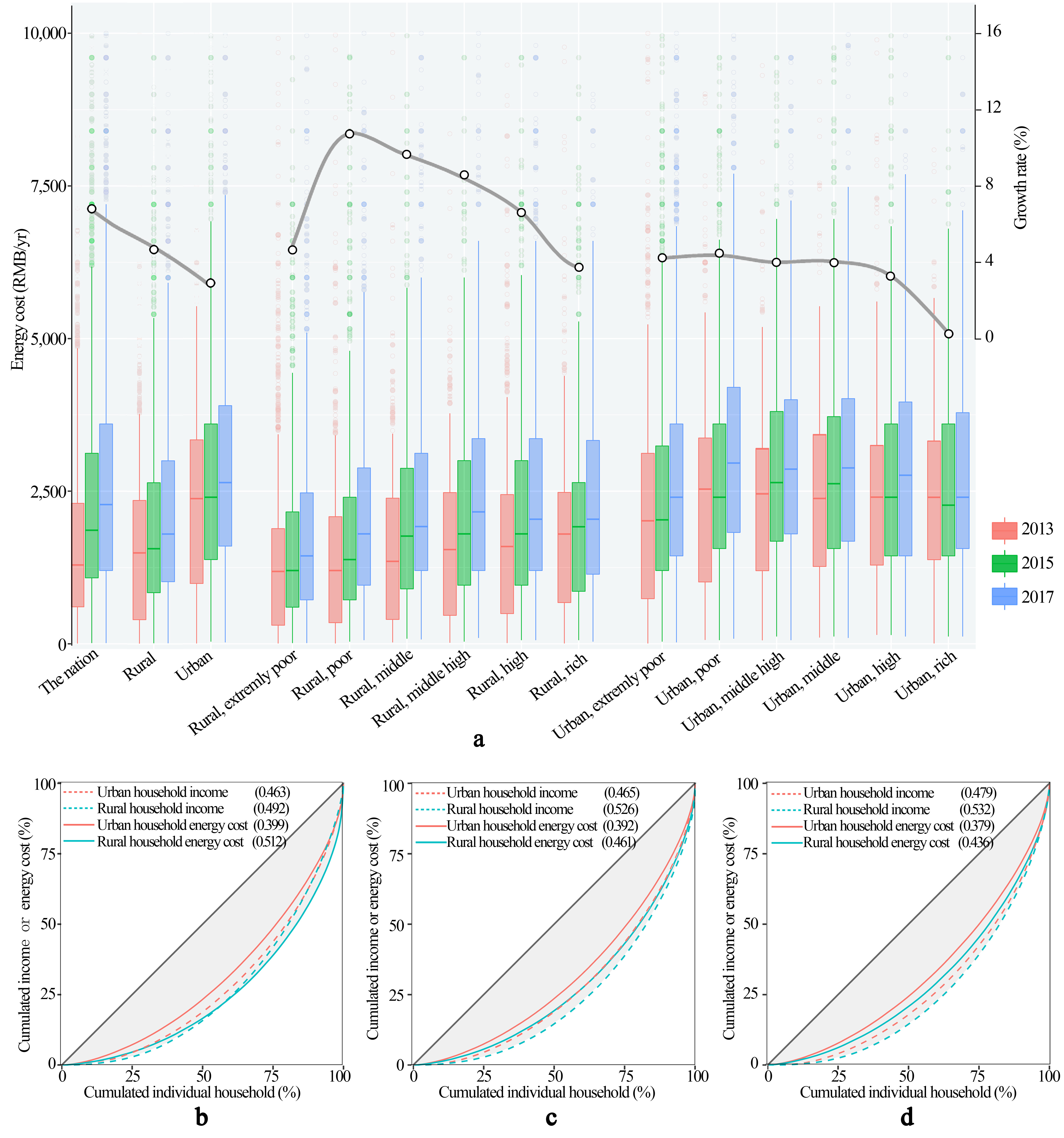 Our findings indicated that, with a dramatic increase in energy costs for households that switched from traditional solid fuels to clean energy, the energy cost-based inequality had declined within either urban or rural areas. However, the inequality level within the rural areas was still high, with the Gini index being 0.436 in 2017. Moreover, unlike urban households which experienced a decline in energy burden from 5.4% to 4.8% during 2013-2017, the energy burden on rural households was reinforced (increased from 5.3% to 6.5%). When measuring energy inequality in energy burden, we found that, during the rapid energy transition, both urban-rural and regional inequality in energy burden were aggravated to some extent.