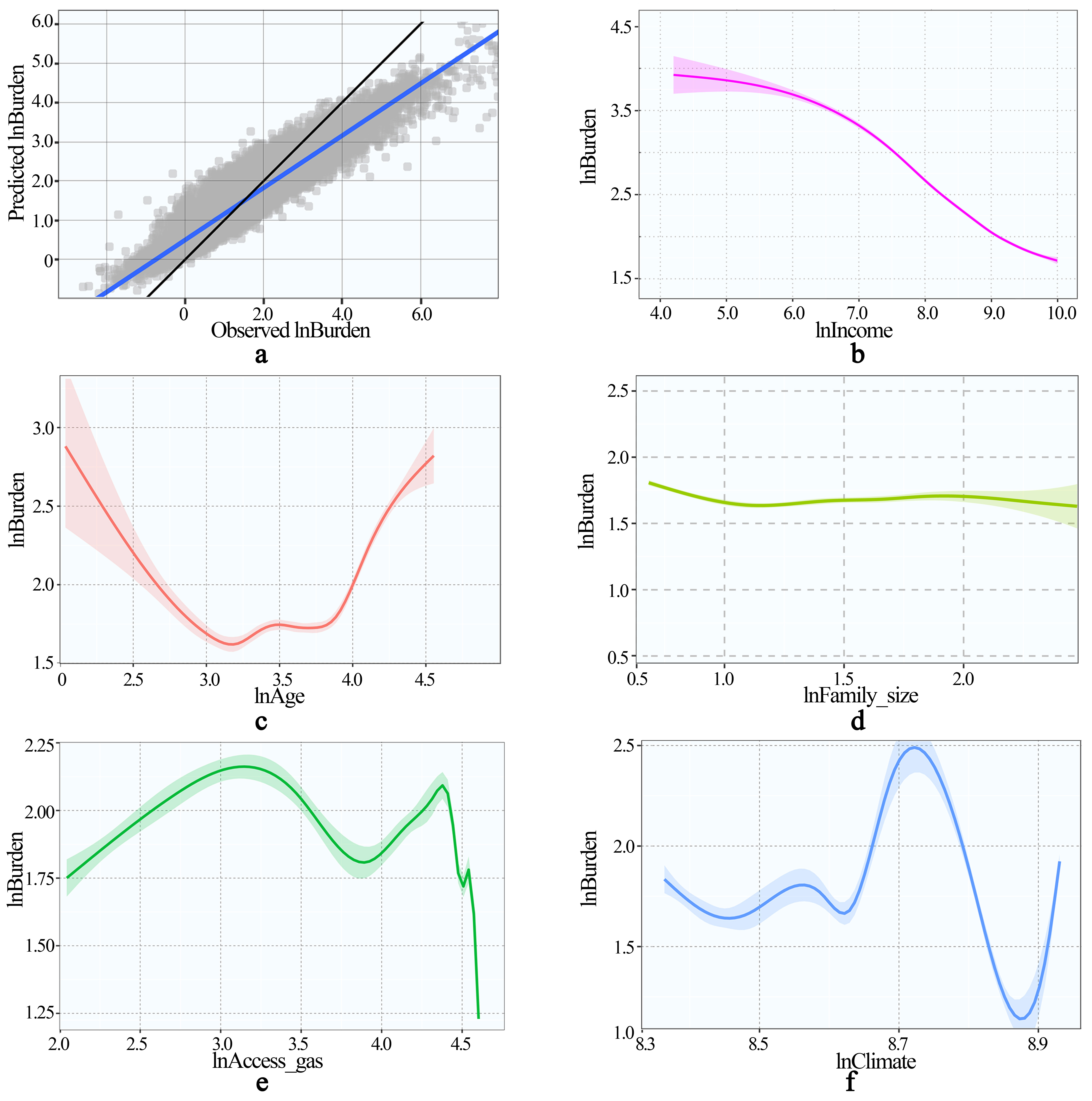 Performance in the random forest regression model. a. Comparison between the observed and model-predicted lnBurden (R2=0.883), the x=y lines are shown in black, and the line of best fit in blue. b – f. Relationship between the household energy burden and the indicator of lnIncome (b); and lnAge (c); and lnFamily_size (d); and lnAccess_gas(e); and lnClimate (f). The 95% confidence intervals are shown by the shaded areas in b – f.