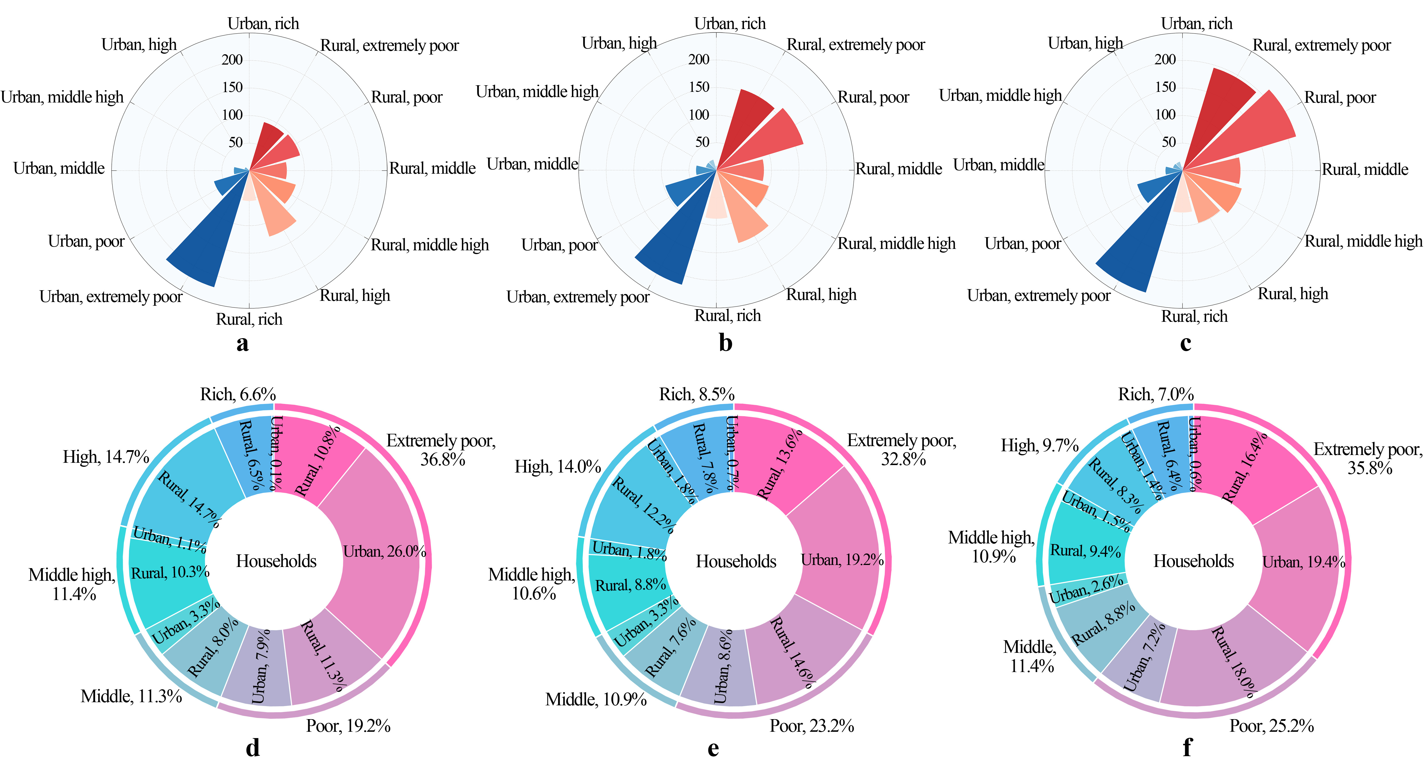 Distribution patterns of households with residential energy transition by income groups. a, b, c, Sample sizes of households switched from solid fuels to clean fuels (a) before the wide implementation of energy transition programs, and (b, c) during the period of a rapid transition in support of government efforts. d, e, f, Percentages of households that switched from solid fuels to clean fuels by income groups (d) during 2011-2013, (e) during 2013-2015, and (f) 2015-2017.