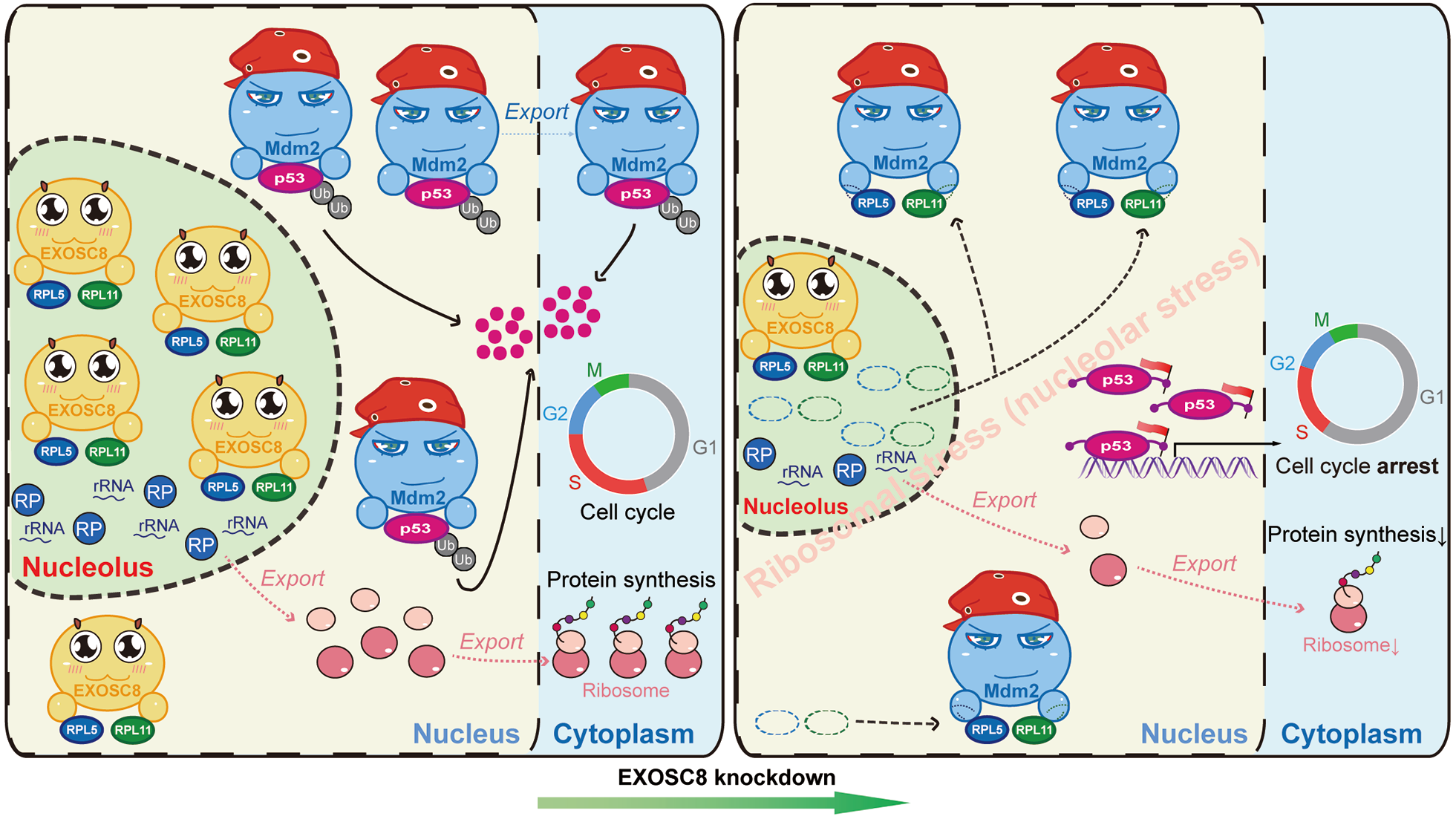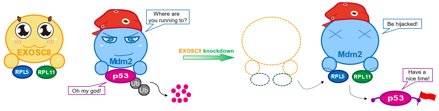 The research logic and method of transcription factor and enzyme genes, etc. are clear and mature. However, EXOSC8, as an RNA exosome gene, how to find its mechanisms in CRC? Fortunately, first, our systemically and comprehensive biological analysis pointed out that EXOSC8 was meaningfully correlated with ribosome biogenesis-related processes in CRC; second, after our previously Pan-cancer study was published, a new study in 2020 suggested that EXOSC8 or EXOSC9 knockdown leads to a significant increase in p53 protein levels [9]; third, we noted that some rRNA metabolism-related genes, such as PNO1 and RRS1, could regulate RPs-Mdm2-p53 signaling in CRC and hepatocellular carcinoma, respectively [10, 11]. These findings motivated our next analyses and wet-lab experiments design. Our bioinformatic analyses and wet-lab experiments demonstrated that EXOSC8 knockdown increased p53 levels in CRC, and the oncogenic proliferation phenotypes of EXOSC8 depended on p53 in vitro and in vivo. Impressively, a series of protein-related assays suggested that when EXOSC8 is silenced, RPL5/11 would be released into the nucleoplasm and bind Mdm2, resulting in a decrease in the Mdm2-mediated ubiquitination and degradation of p53.