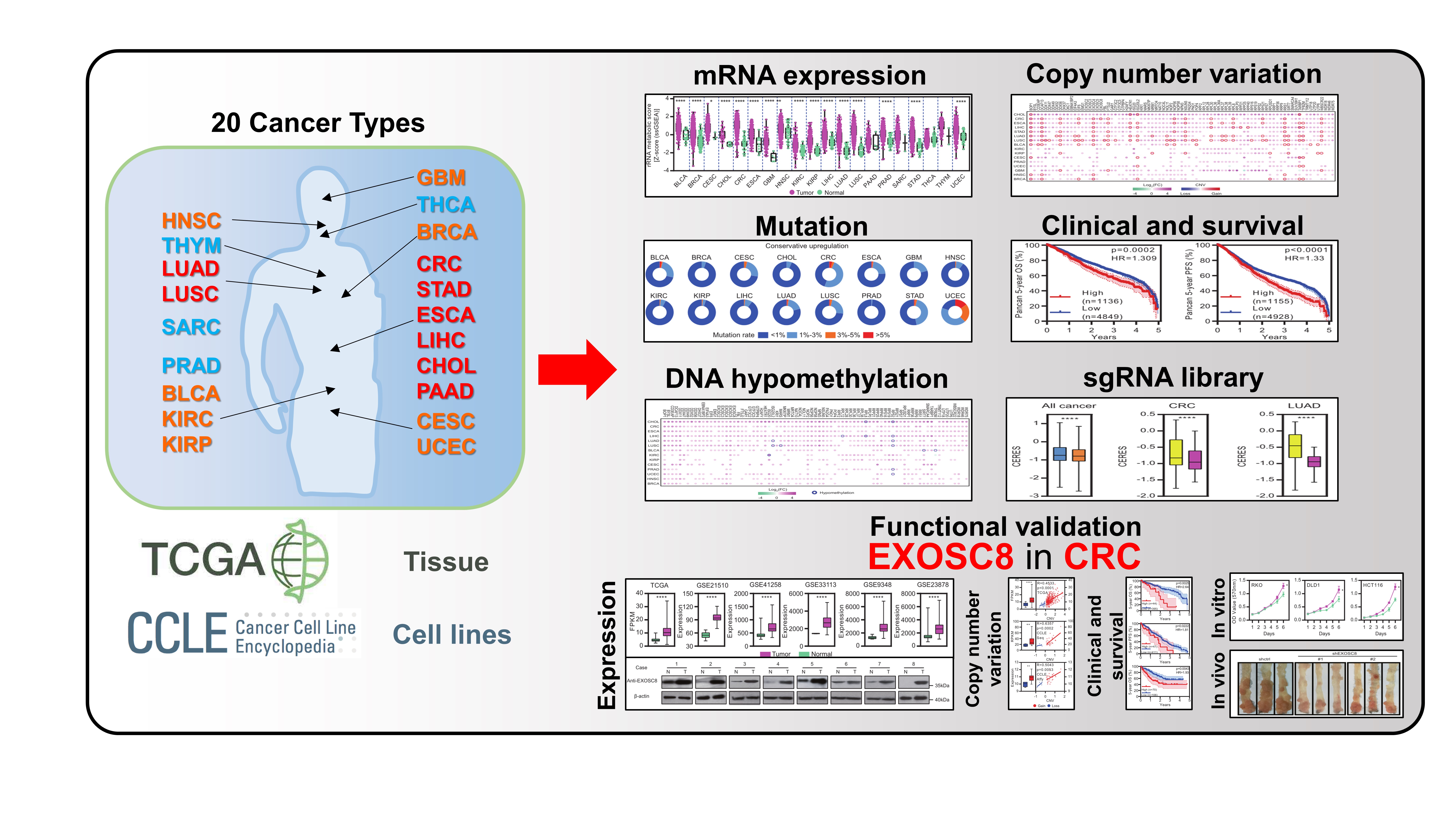 The rRNA metabolic process is critical for protein synthesis and increased protein synthesis is required for tumorigenesis. rRNA metabolism-related genes are defined as genes associated with the chemical reactions and pathways involved in rRNA, such as ribosomal proteins (eg. RP5 and RPL11), DEAD/DEAH-box helicases (eg. DDX56), exosome components (eg. EXOSC8), small subunit processome components (UTP18), and WD repeat domain proteins (eg. WDR36) [1]. Moreover, to gain analytical breadth, and define commonalities, differences and emergent themes across human cancers, Pan-cancer analysis is beginning to be used in cancer research [2]. Thus, when I studied at Wuhan university (successive postgraduate and doctoral programs of study), I performed a Pan-cancer analysis of rRNA metabolism-related genes across 20 human cancers under the supervision of my Ph.D. supervisor (Prof. Li). A landscape of rRNA metabolism-related genes was established in human cancers [1]. We found that rRNA metabolism-related genes are upregulated in multiple cancers, particularly in digestive and respiratory system cancers. Most of the upregulated genes were driven by copy number variation (CNV) gain rather than mutation or DNA hypomethylation. We systematically identified CNV-driven rRNA metabolism-related genes with clinical relevance, including a critical candidate oncogene: EXOSC8, also named Rrp43p and OIP2. EXOSC8 is an essential protein of the exosome core, and the depletion of EXOSC8 results in a severe growth defect in yeast [3]. It was reported that EXOSC8 is necessary for the efficient maturation of 5.8S, 18S and 25S rRNA in S.cerevisiae [4]. Interestingly, EXOSC8 has not been reported in human cancer at that time. We therefore performed basic functional experiments in vitro and in vivo, including MTT assays and AOM/DSS-induced CRC mouse model. Our data indicate that EXOSC8 could serve as a valuable new biomarker and prognostic factor for CRC. This Pan-cancer study demonstrates that our analysis could be an effective resource to functionally identify rRNA metabolism-related genes with clinical relevance in human cancers. However, further functions and mechanisms of EXOSC8 in CRC were not clear, in particular its roles in ribosome biogenesis-related processes.