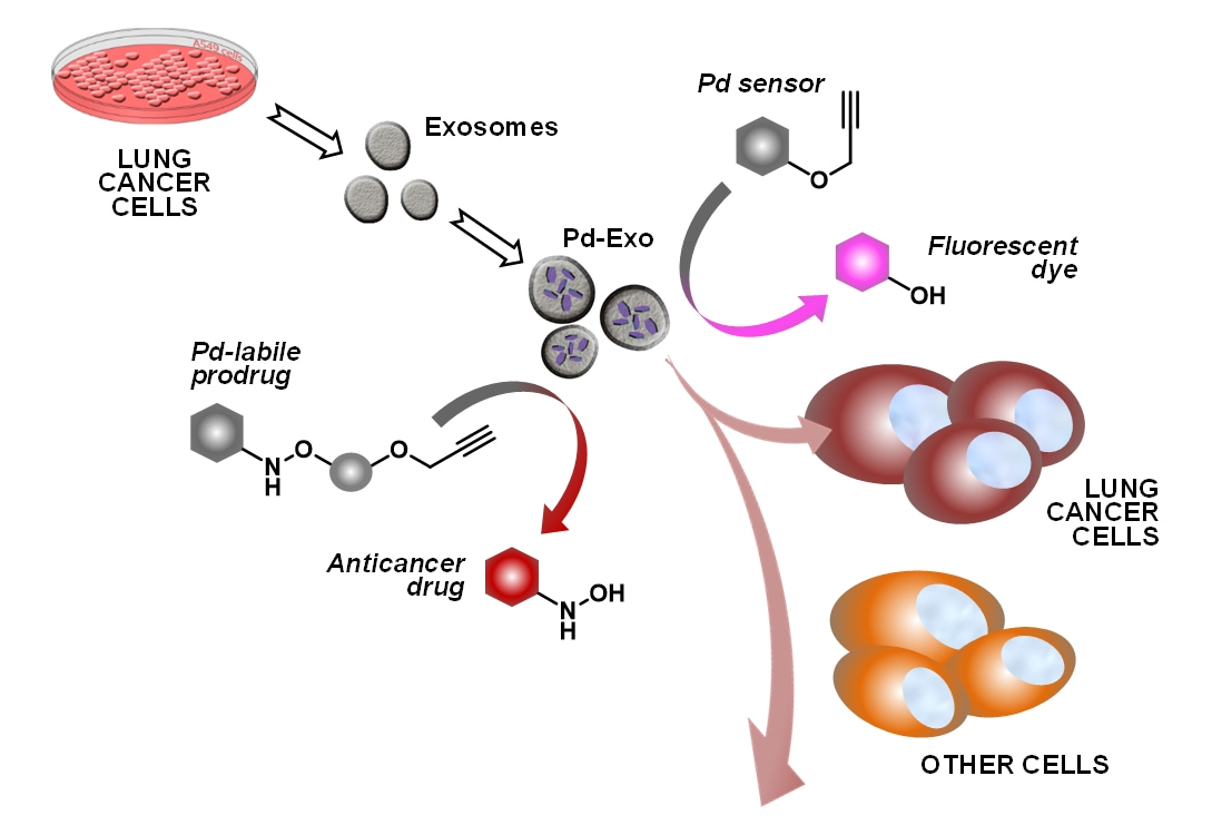 Exosomes are small lipid vesicles secreted by most eukaryotic cells that can be taken up by recipient cells at short and long distances. The intercellular trafficking of exosomes provides an effective communication framework to exchange biomolecules and regulate physiological functions between parented cells, including cancer cells. This selective transport system is exploited by some viruses to spread and infect neighbouring and distant cells, and has inspired researchers to investigate their use to shuttle therapeutics into specific cell types. Now, in a collaboration between the Universidad de Zaragoza (led by Prof Jesús Santamaría) and the University of Edinburgh (Innovative Therapeutics Lab), it is shown that this communication system can be hijacked to deliver active palladium catalysts and perform abiotic chemistries into selected cancer cells (see Figure 1).