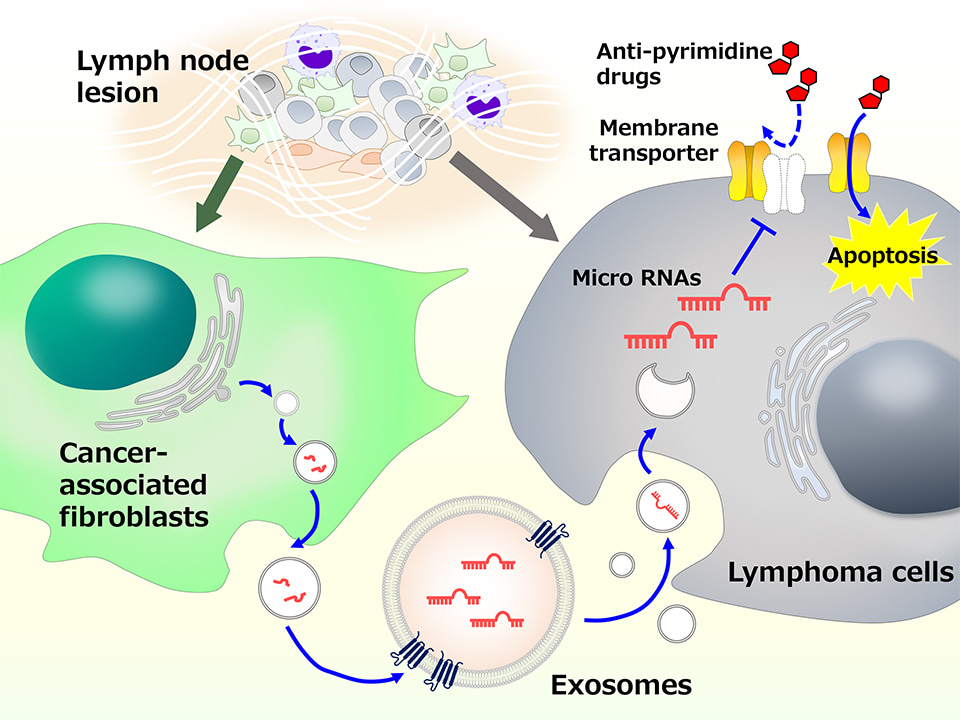 In this study, we identified exosomes, which are 30- to 150-nm nanovesicles, as a main component of extracellular vesicles. As expected, glycolysis increased in the lymphoma cells in the presence of exosomes. Moreover, the inhibition of exosome secretion from CAFs decreased the survival of the lymphoma cells. To test the clinical significance of CAF-derived exosomes, we subsequently investigated the changes in the susceptibility of lymphoma cells to anti-cancer drugs in the presence of exosomes. We found that exosomes induced anti-pyrimidine drug resistance in lymphoma cells through the modulation of its transporter, ENT2. We also found that miR-4717-5p, which was one of the most abundant miRNAs in the exosomes of the CAFs, was involved in this phenomenon.