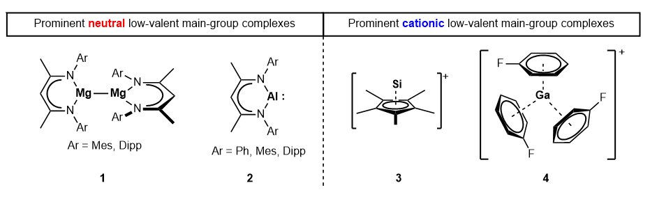 Figure 1: Examples for low-valent main-group complexes. Anions for 3 and 4 omitted for clarity.