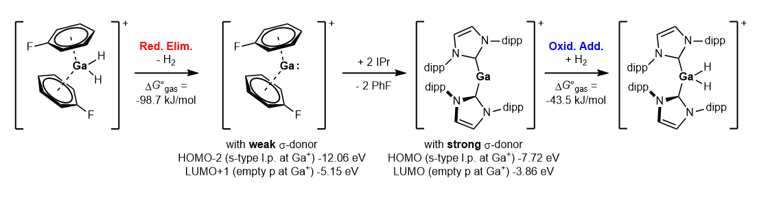 Scheme 1: Computed gas phase thermodynamics for reaction of low-valent gallium cations towards dihydrogen depending on donor-strength of the ligands. All calculations performed at pbe0-d3bj/def2tzvpp//bp86-d3bj/def2svp-level of DFT (density functional theory). The reductive elimination reaction has already been observed experimentally by Wehmschulte et al.[6] The Ga+-carbene complex is literature-known.[11]