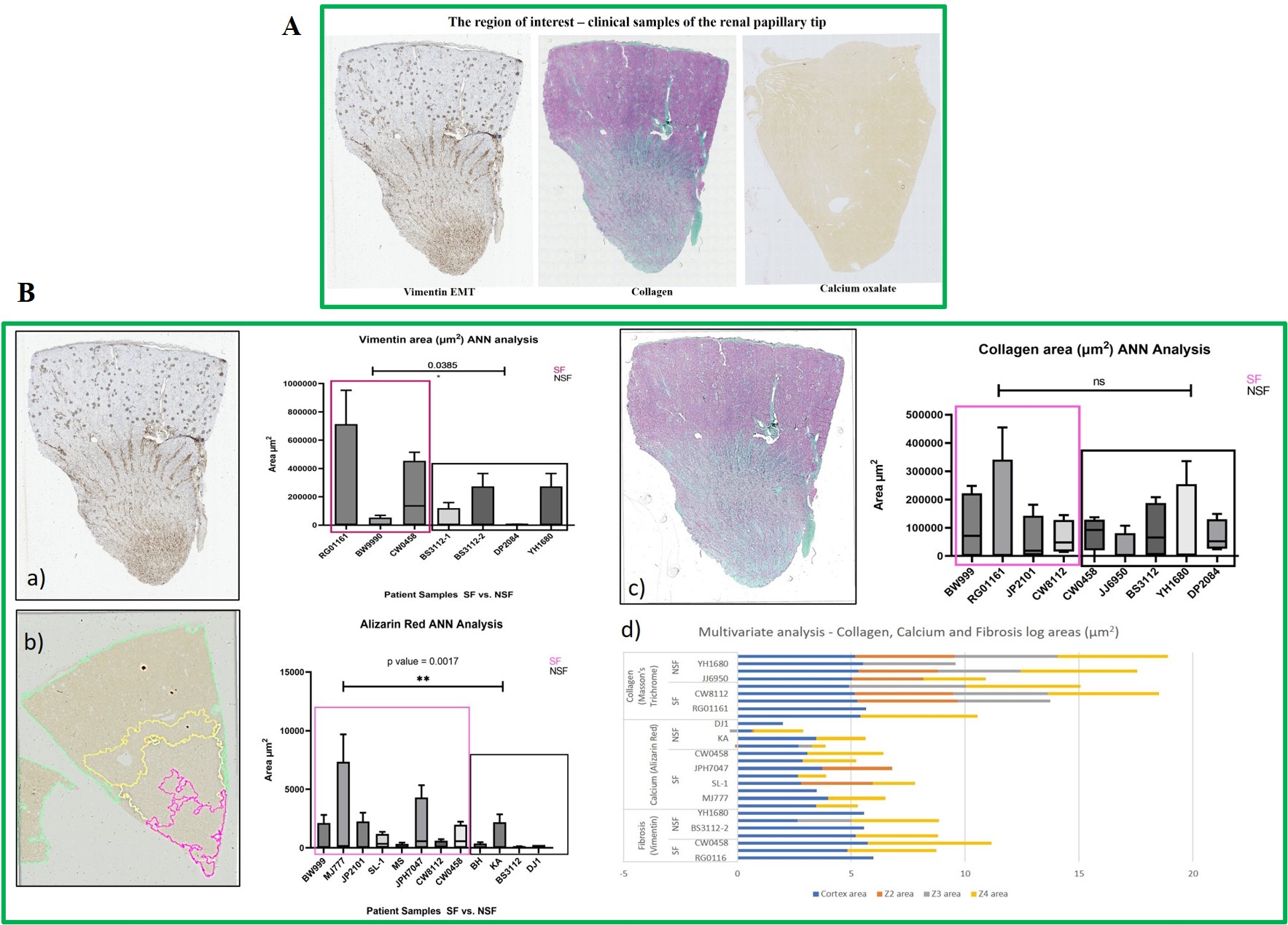 Using histology sections for analyses with an artificial neural network derived from quantitative pathology (quPath) software, I first measured the key biomarkers of renal calcification, and these outcomes guided the subsequent development of organ-on-a-chip functional assays. In detail, the epithelial-to-mesenchymal transitions visualized with vimentin-DAB are a precursor of fibrosis and subsequent calcification, the biomarker was significantly expressed in renal stone forming patient samples (SF) compared to non-stone formers (NSF). Collagen is another biomarker of renal injury and fibrosis that we visualized with Masson's trichrome for quantification, upregulated in the renal papillary region due to shear stress. Stone forming patients showed significantly higher levels of collagen deposition vs. non-stone formers. We used the Alizarin red dye to visualize and identify renal calcification, where calcium deposits appeared as crimson aggregates across the tissue. As expected, renal stone-formers showed higher levels of calcium deposits due to dye uptake compared to NSF. In our study, the papillary tip region of all stone-forming patient samples exhibited the key biomarkers of collagen deposition (Masson's Trichrome), epithelial-mesenchymal transitions (vimentin-DAB), and calcification (Alizarin Red) in greater quantity than non-stone formers (Figure 9) [Jeewandara 2023].