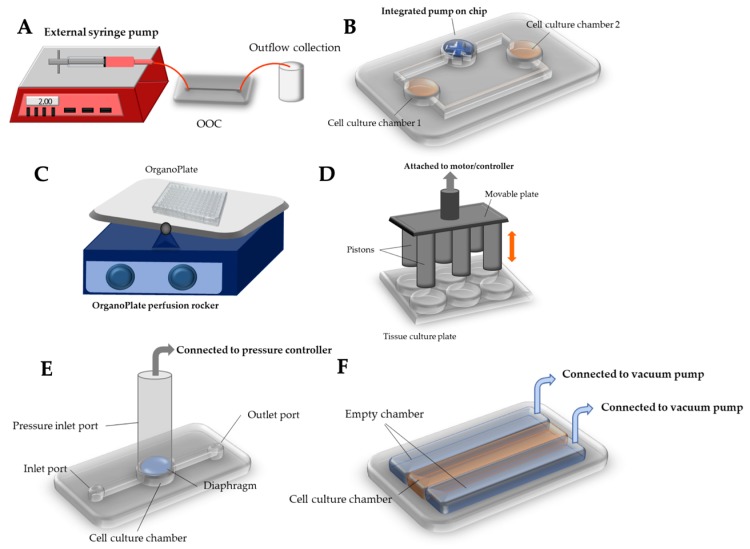 Figure 7: Innovative methods and equipment in use to deliver pathological mechanical stimuli to the organ-on-a-chip system aside from regular shear flow. A) external syringe pump to deliver shear flow, B) integrated micropump within a microfluidic organ-on-a-chip system to drive either laminar or pulsatile flow, C) compressive force delivered on a tissue culture plate, E) compressive force delivered by a pressure regulator, F) stretch or strain generated by periodically applying vacuum to the peripheral chambers to allow the main chamber to stretch cyclically [Kaarj 2019].