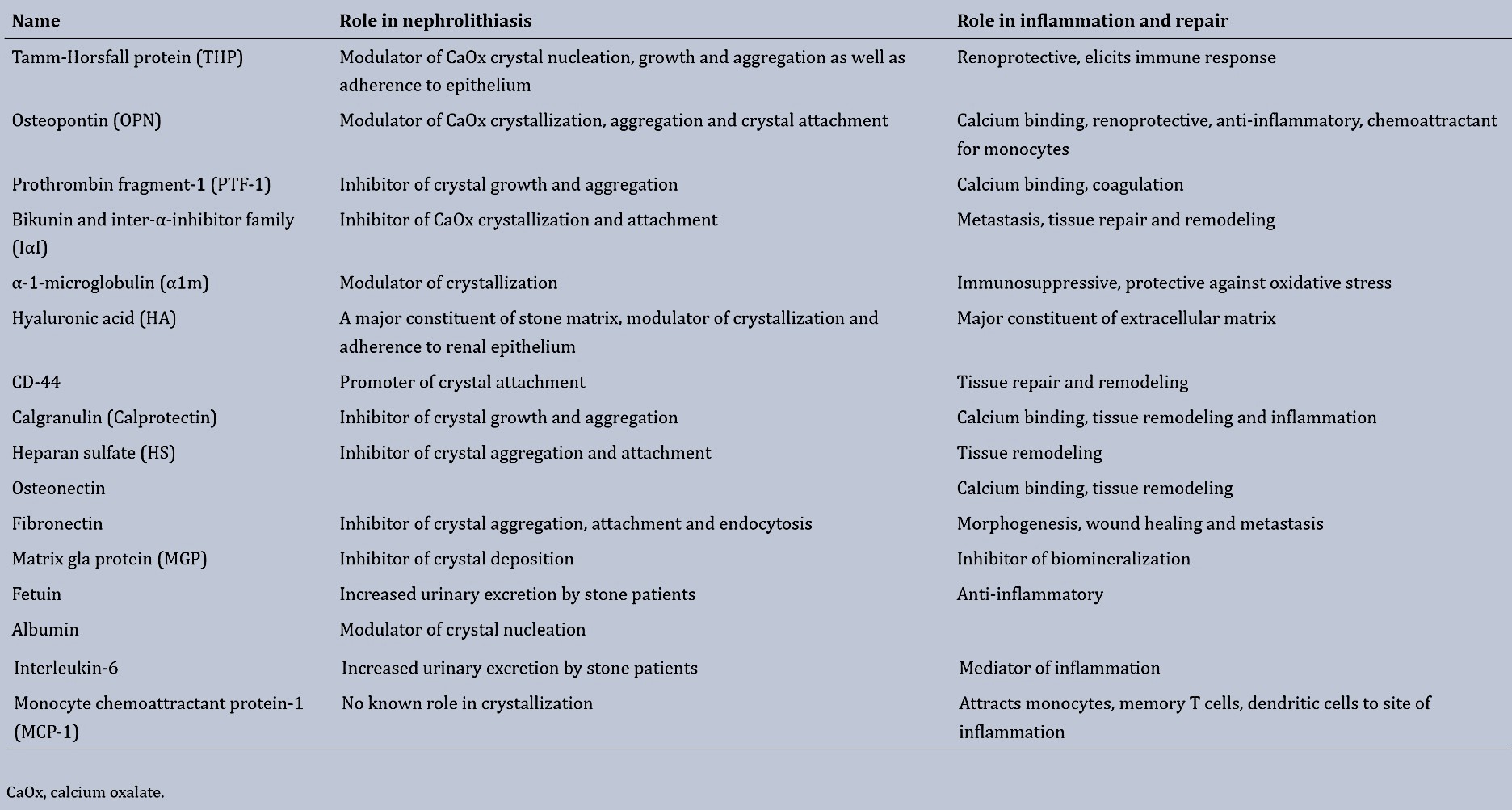 Table 1: Urinary macromolecules and their role in crystallization and inflammation [Khan 2014].