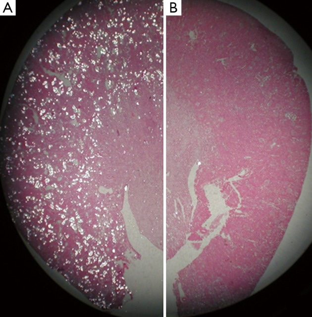 Figure 8: Experimental outcomes of hematoxylin and eosin-stained paraffin sections of a kidney obtained from a hyperoxaluric rat model. Tissue sections were examined under light microscopy to indicate; A) a hyperoxaluric rat with renal tubules full of birefringent calcium oxalate crystals, b) hyperoxaluric rat receiving an antioxidant apocynin showed only the presence of a few birefringent crystals of calcium oxalate. Credit: [Khan 2014].