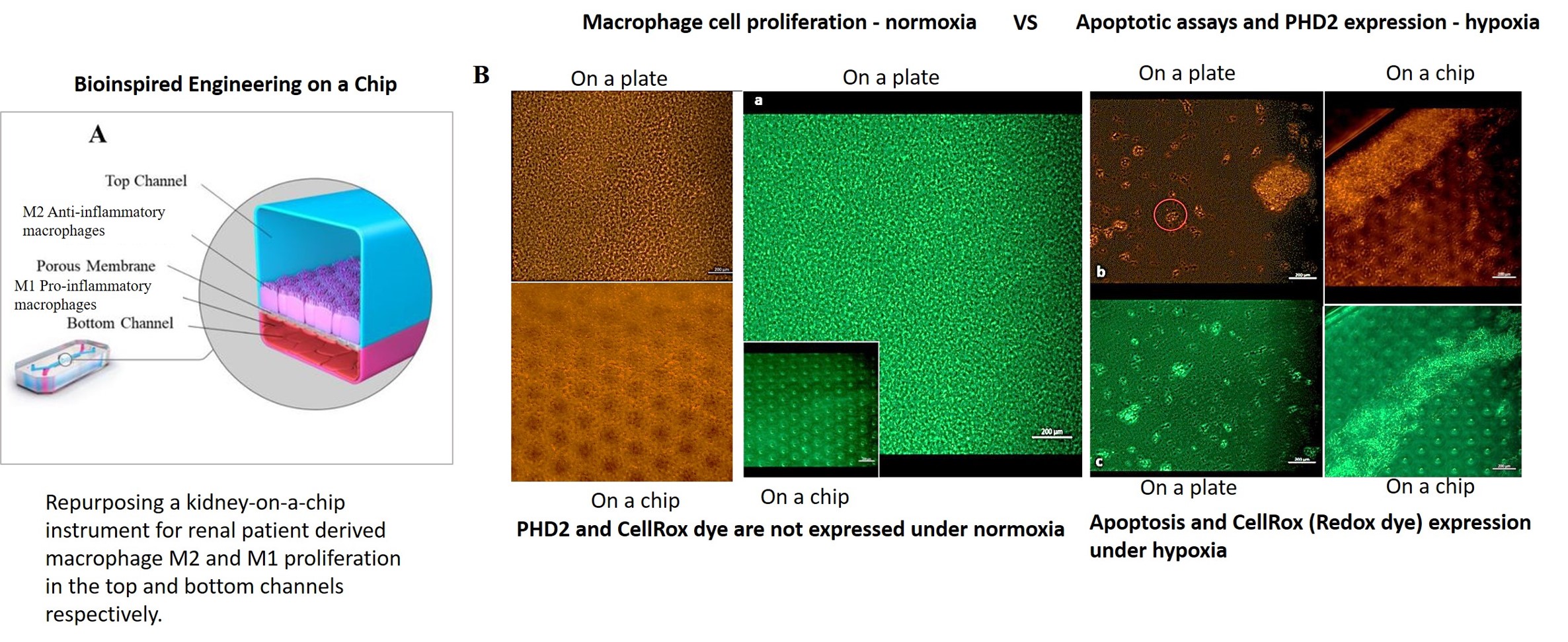 First-in-study outcomes have already verified the upregulation of PHD2 biomarkers during oxidative stress induced cell death via in vitro apoptotic assays, using renal patient-derived M1 pro and M2 anti-inflammatory macrophage cell lines cultured on a microfluidic kidney-on-a-chip instrument and on a culture plate, separately (Movie 2ab) [Jeewandara 2023]. These early outcomes of oxidative-stress induced immunofluorescence highlighted the biological switch-like activation of the PHD2 enzyme during hypoxia, to regulate the HIF1α pathway of stone-forming patients, with relevance at the renal papillary tip regions in vivo.