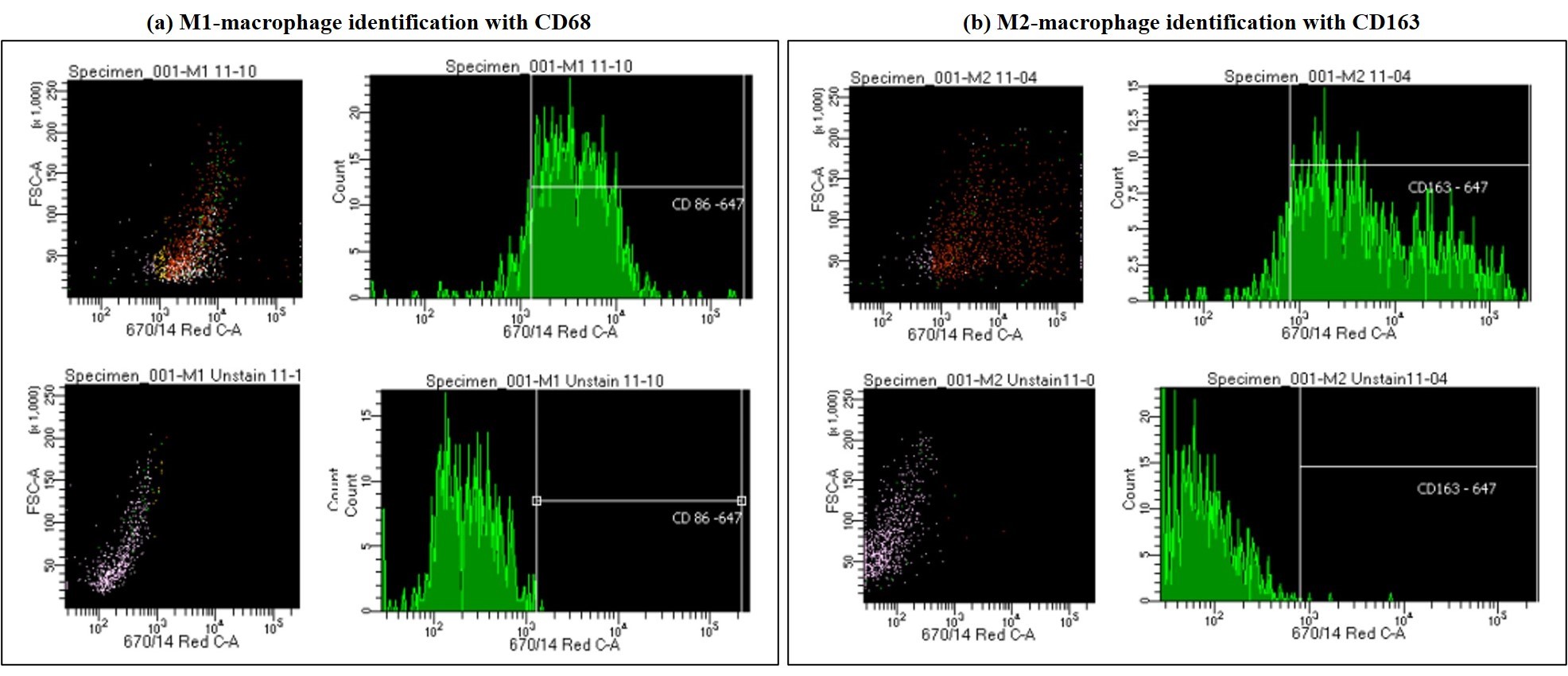 Figure 12: Using fluorescence-activated cell sorting to a) distinguish M1 polarized macrophages stained with CD86 vs. the unstained M1 polarized macrophages, and b) distinguishing M2 polarized macrophages stained with CD163 vs. the unstained M2 polarized macrophages. Image credit: Author’s own.