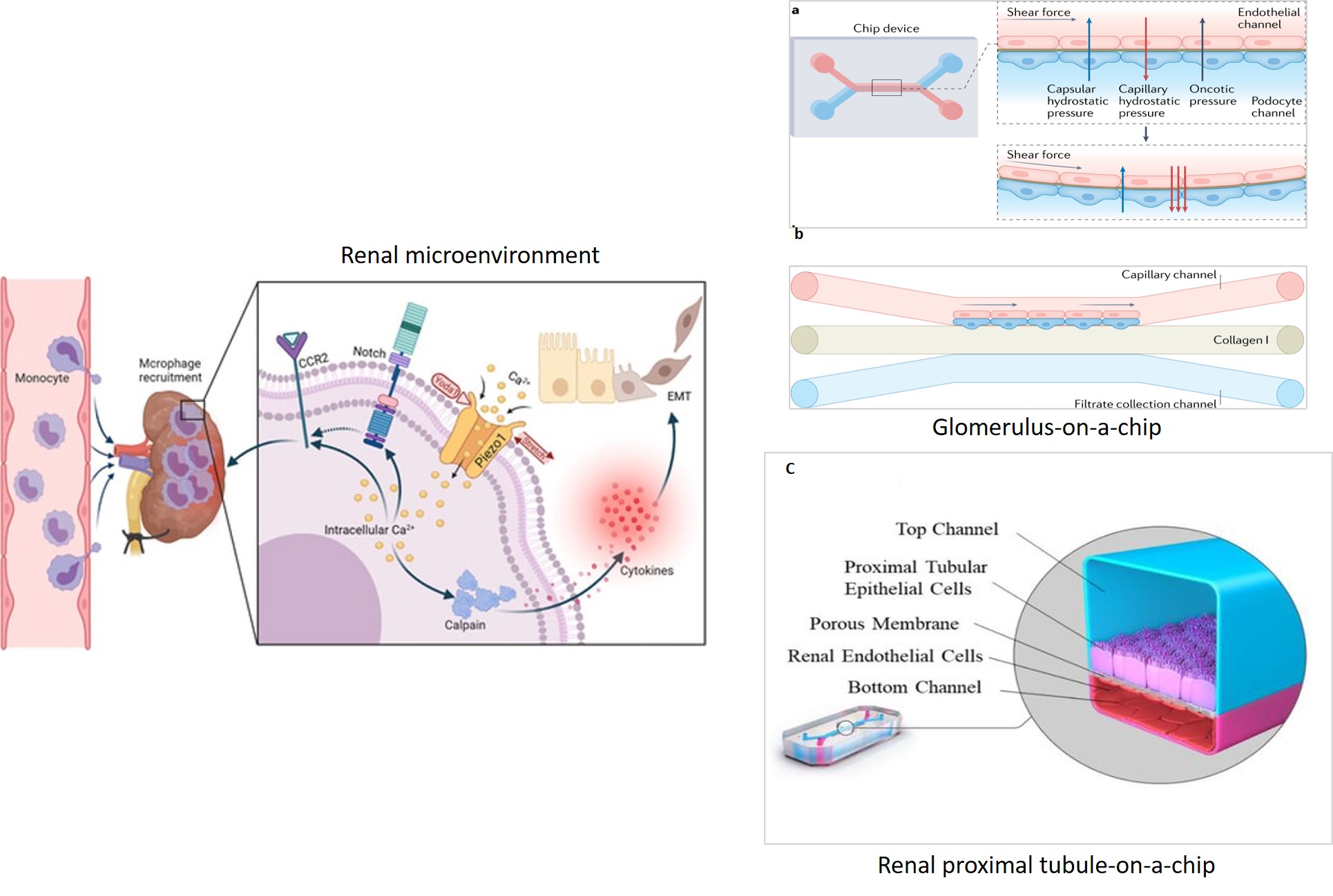 Since basic science experiments already provide evidence to the necessity of both ion channels for shear-stress mediated F-actin disorientation [Swain 2021]. Microfluidic platforms are ideal to carryout shear flow-mediated experiments with human cells, to identify F-actin dysregulation and observe the concerted intracellular effects of Piezo1 and TRPV4. Additionally, aquaporins are another family of membrane proteins that function as water-permeable channels whose impairment can contribute to nephrogenic diabetes. Their role during hypercalciuria and renal concentrating defects leading to renal calcification can be further determined with histology and functional studies for further therapeutic investigations on a chip [Noda 2010, Procino 2012].